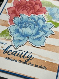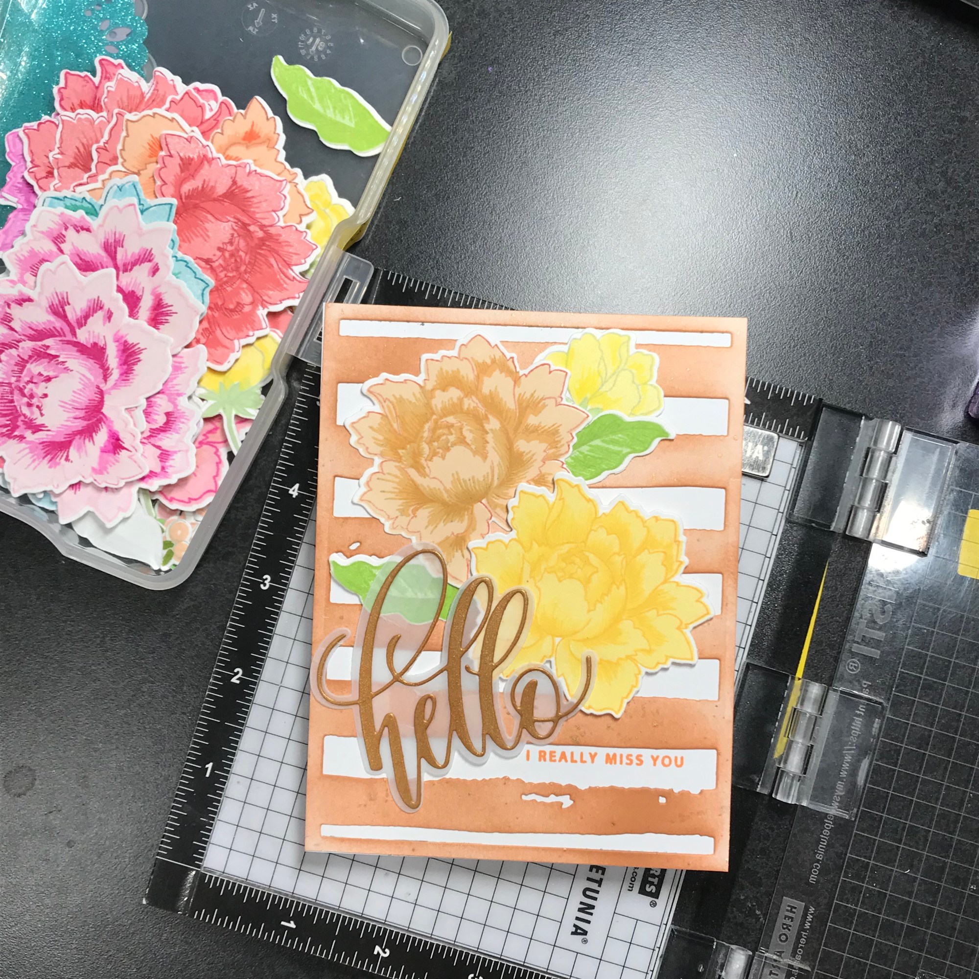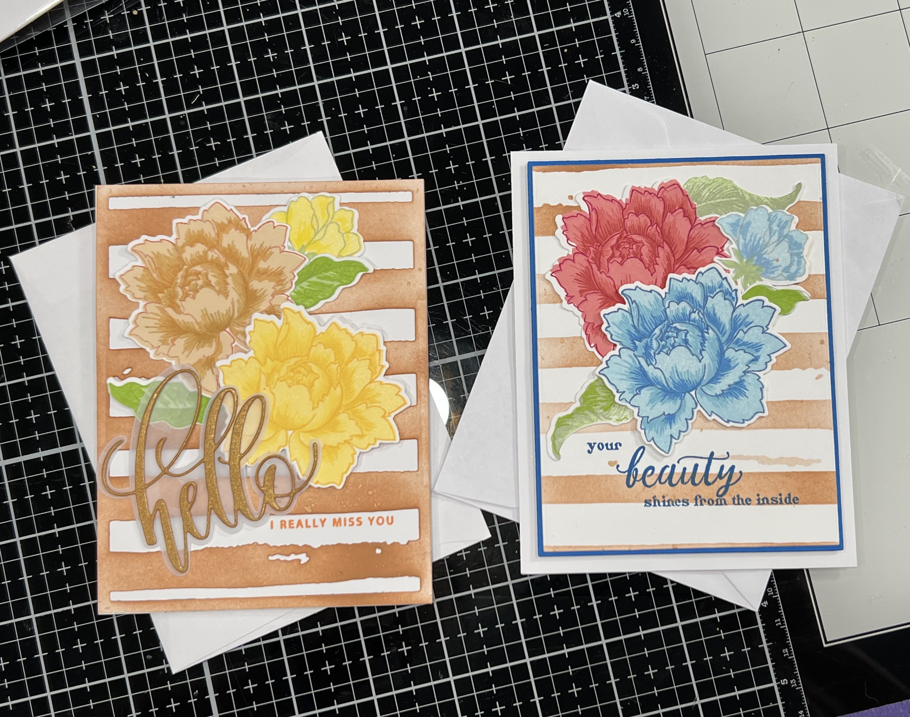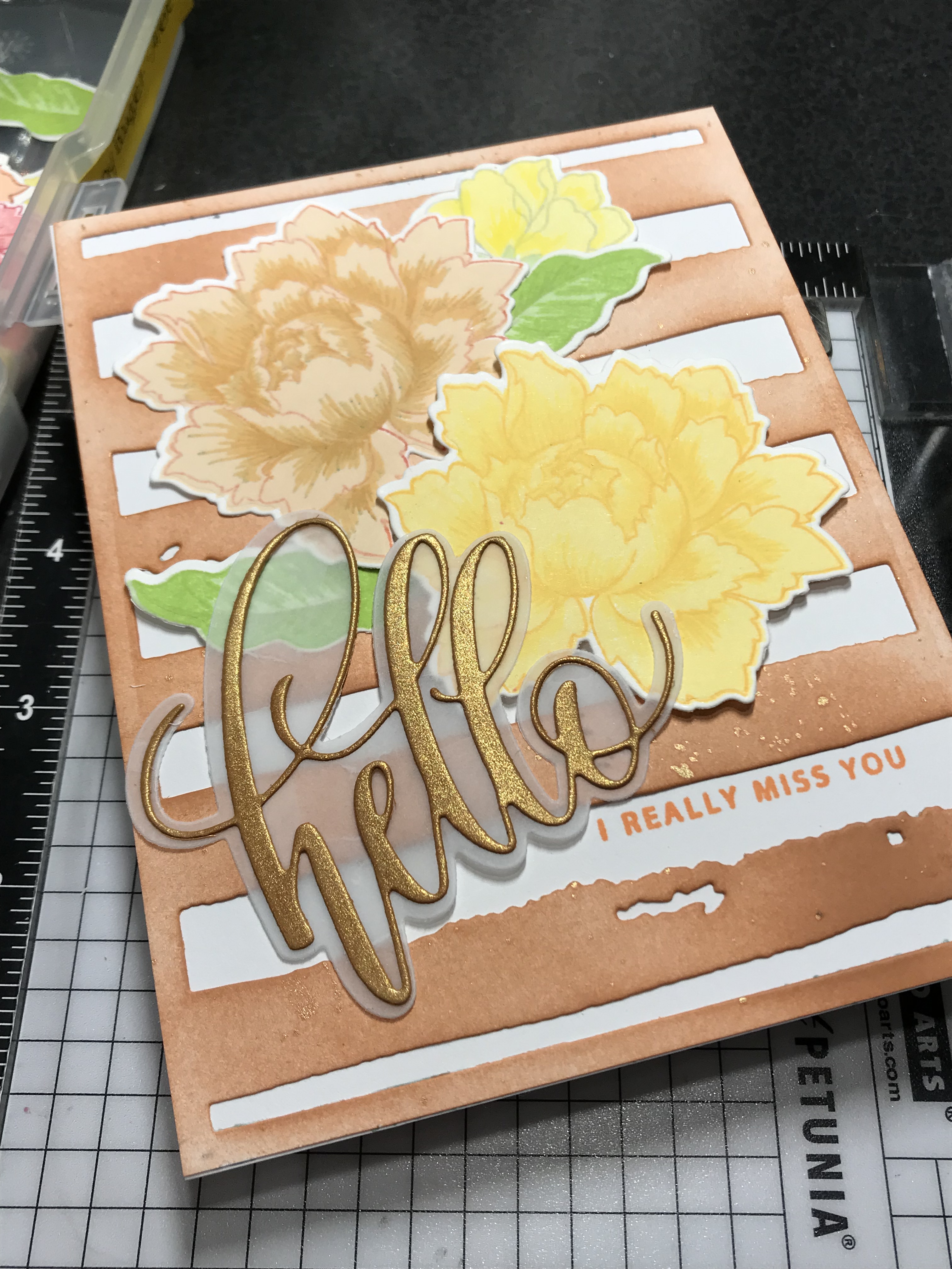 Using an A2 panel of 80 lb Neenah with the die I ink blended over it with Altenew Paper Bag ink to colour the die itself and used it as a stencil for a second panel. The flowers are from my favourite Peony Bouquet stamp and die set. I made a bunch of them while doing my projects for the Layering 2 class.