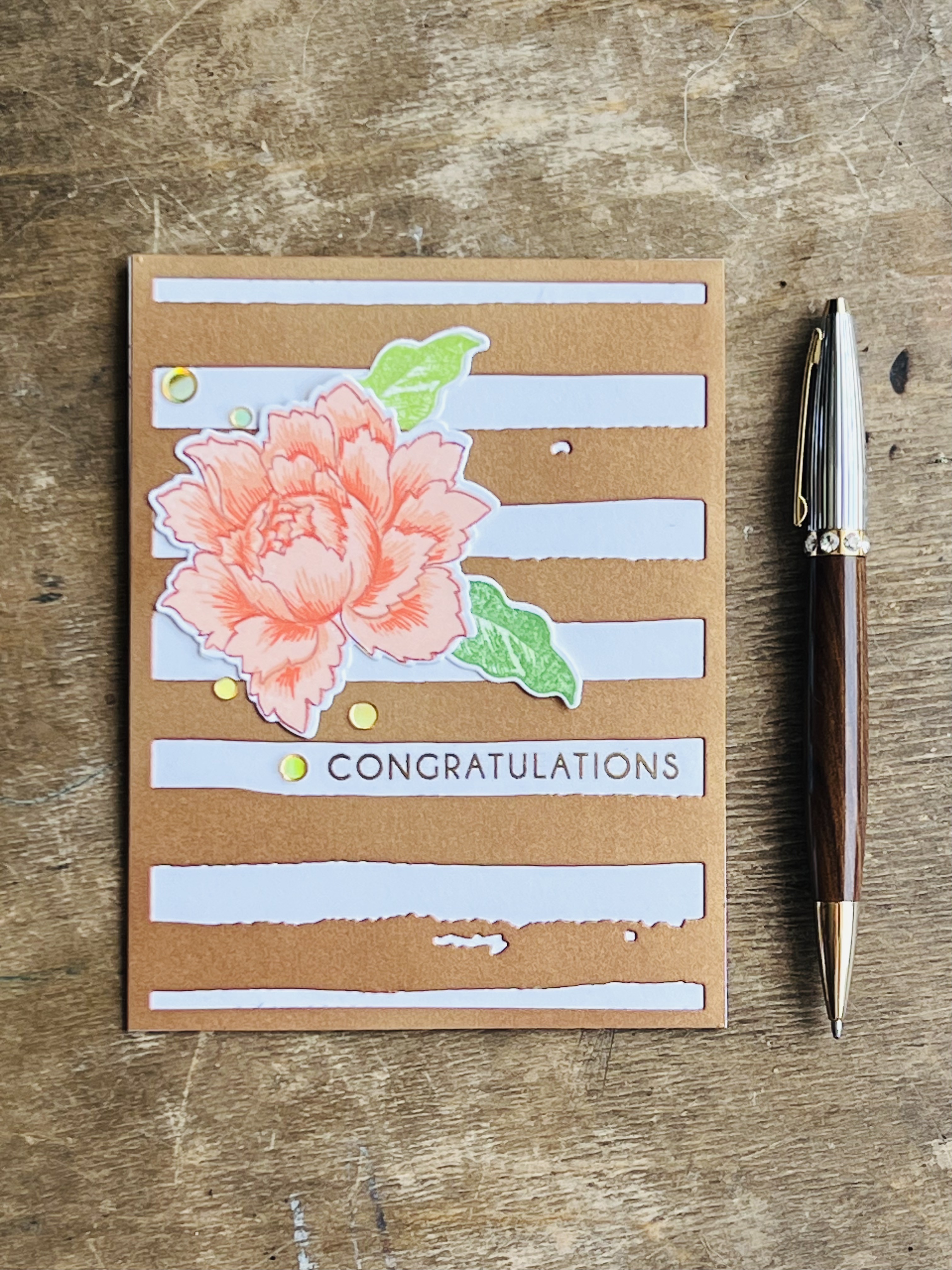 After making lots of blooms with my Altenew Peony Bouquet set it seemed fitting to add another one here. Using all the shades of the Martian Terrain set for this bloom gave it a soft but rich look with the bronzy gold background. The sentiment is from the Altenew Ornamental Bliss stamp set and stamped in Enchanted Gold ink and heat embossed with clear powder .