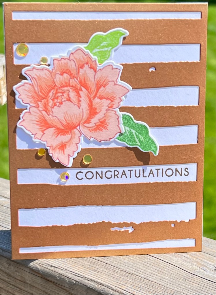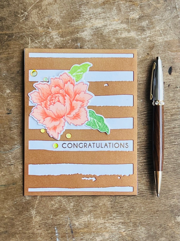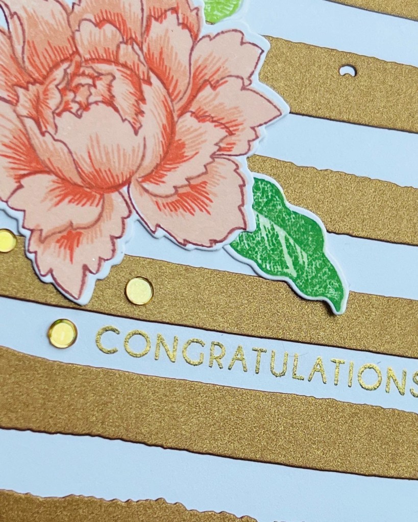 Using a limited colour palette and a single focal image simplifies and gives the card a look that pops. This A2 card is made with the Altenew Watercolour Stripes cover die. I cut out a panel of gold shimmer paper and ink blended over it with Altenew Paper Bag ink. The ink colour softened the colour and gave it more of a bronze sheen.