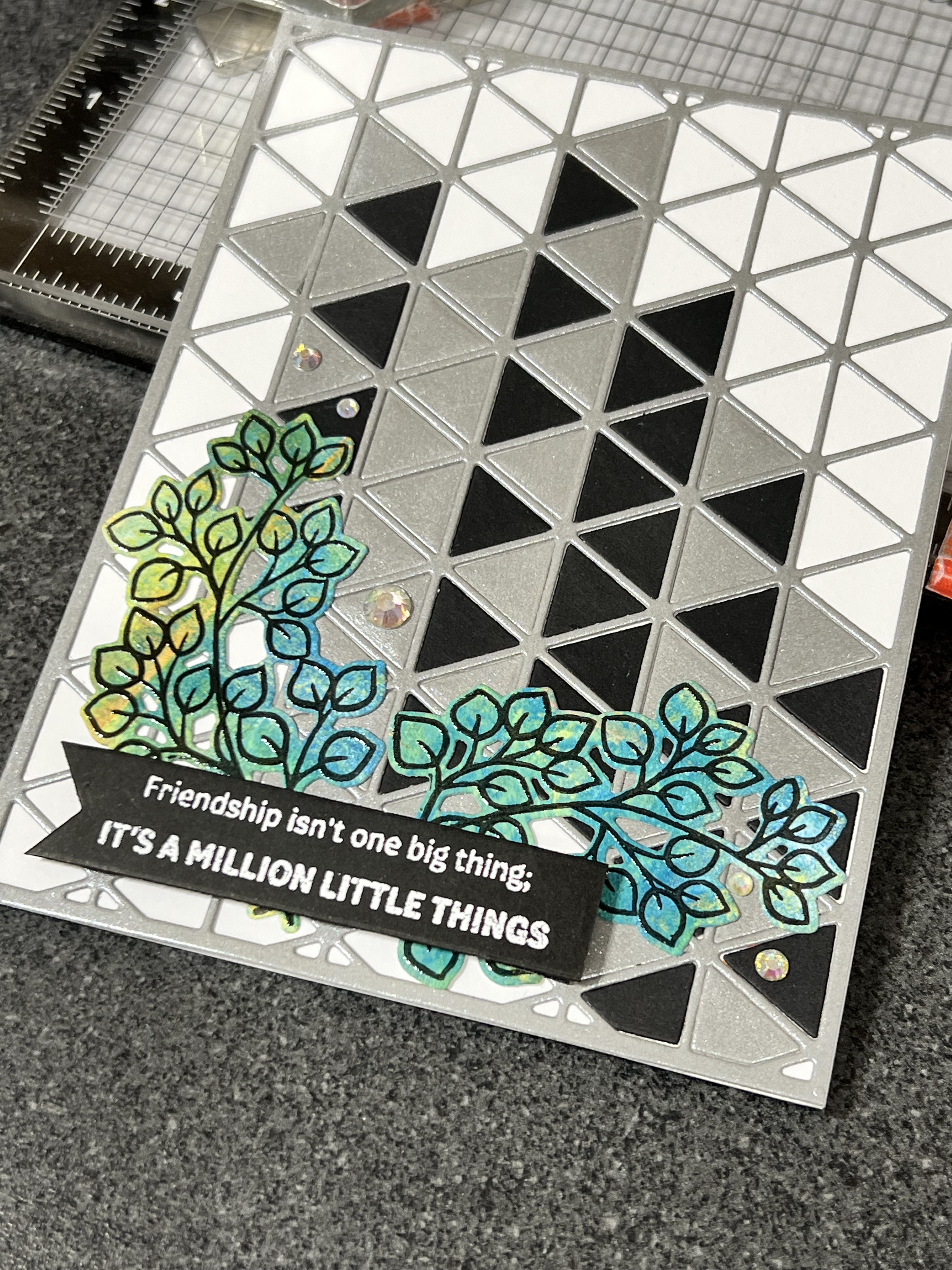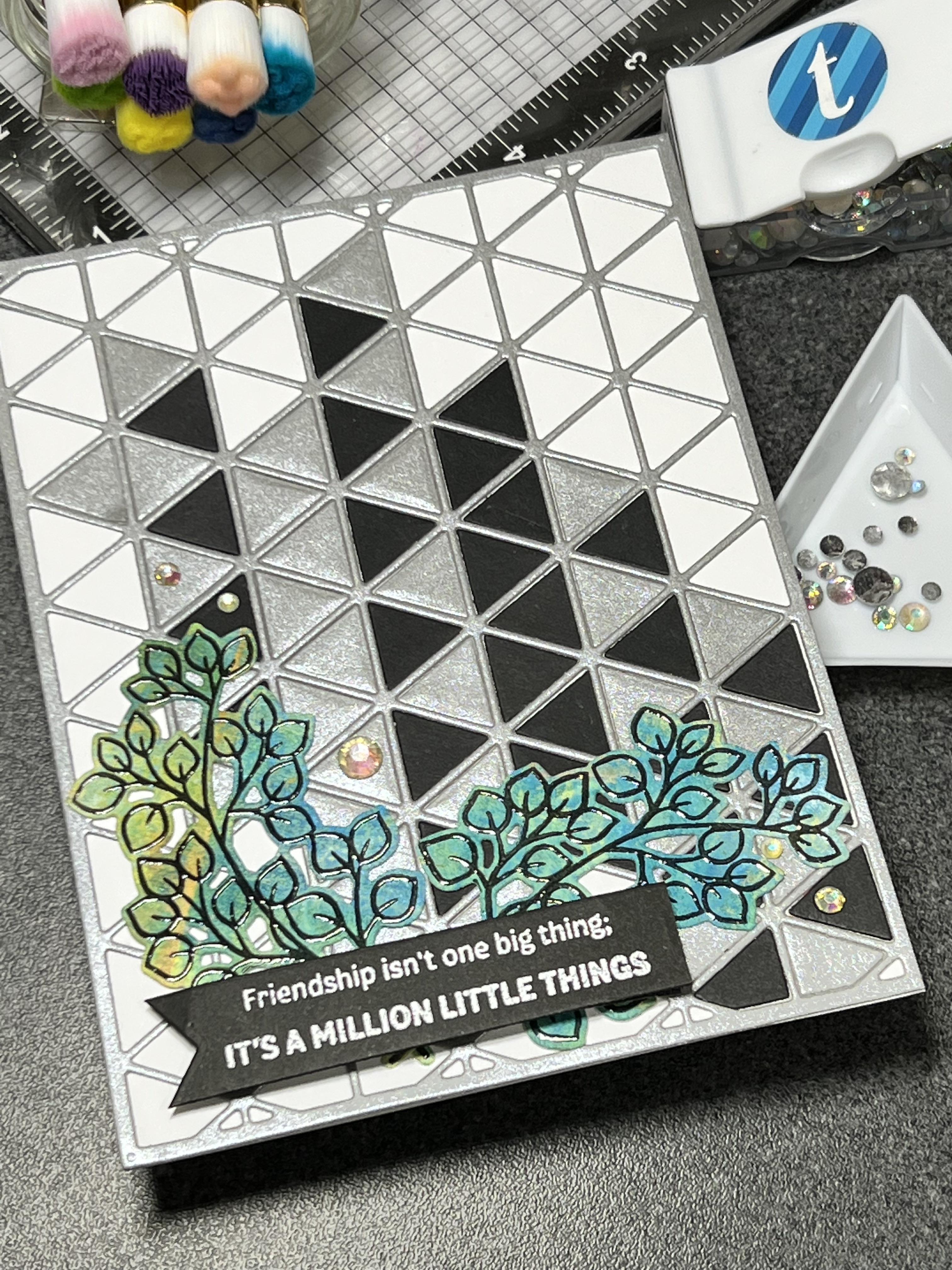 Using the True Friends Sentiment Stamp and Die set I stamped one of the leaf sprays on a pre done gel print panel twice in black and heat embossed in clear for some texture and shine. I cut them out and layered them at the bottom under a popped up sentiment from the same set.