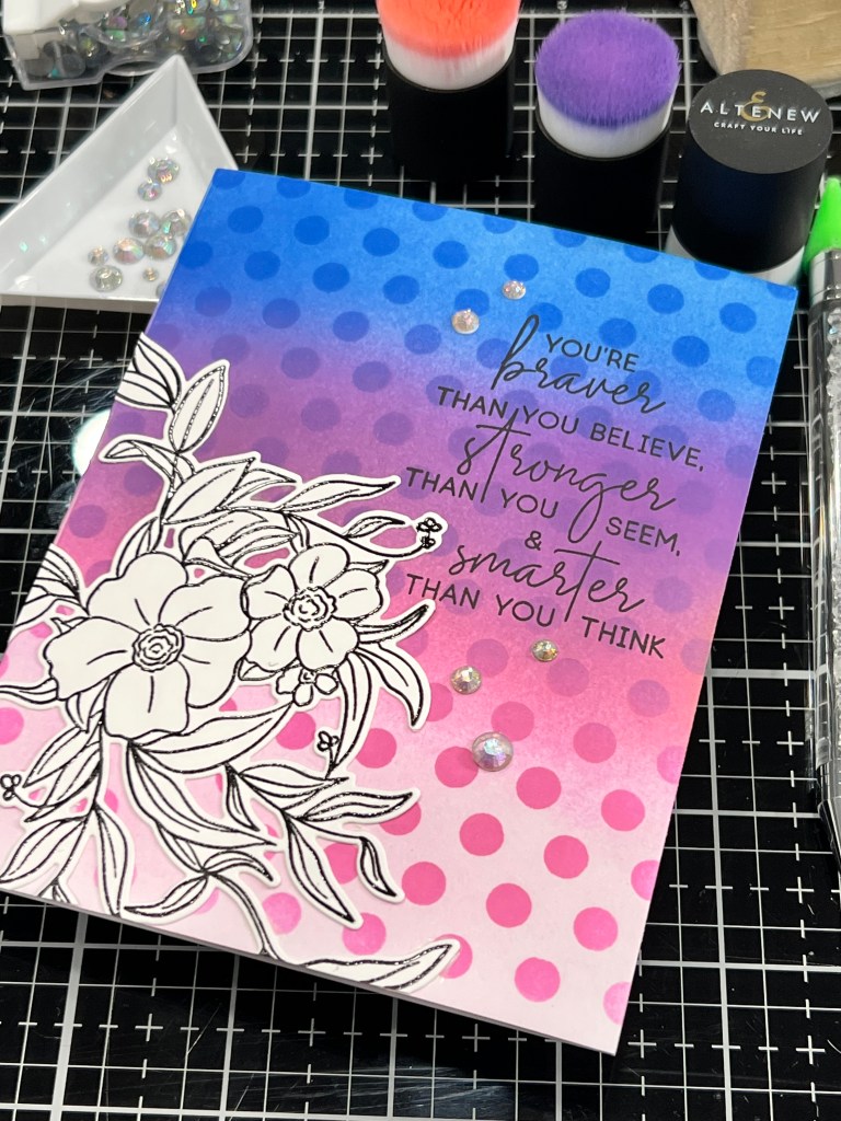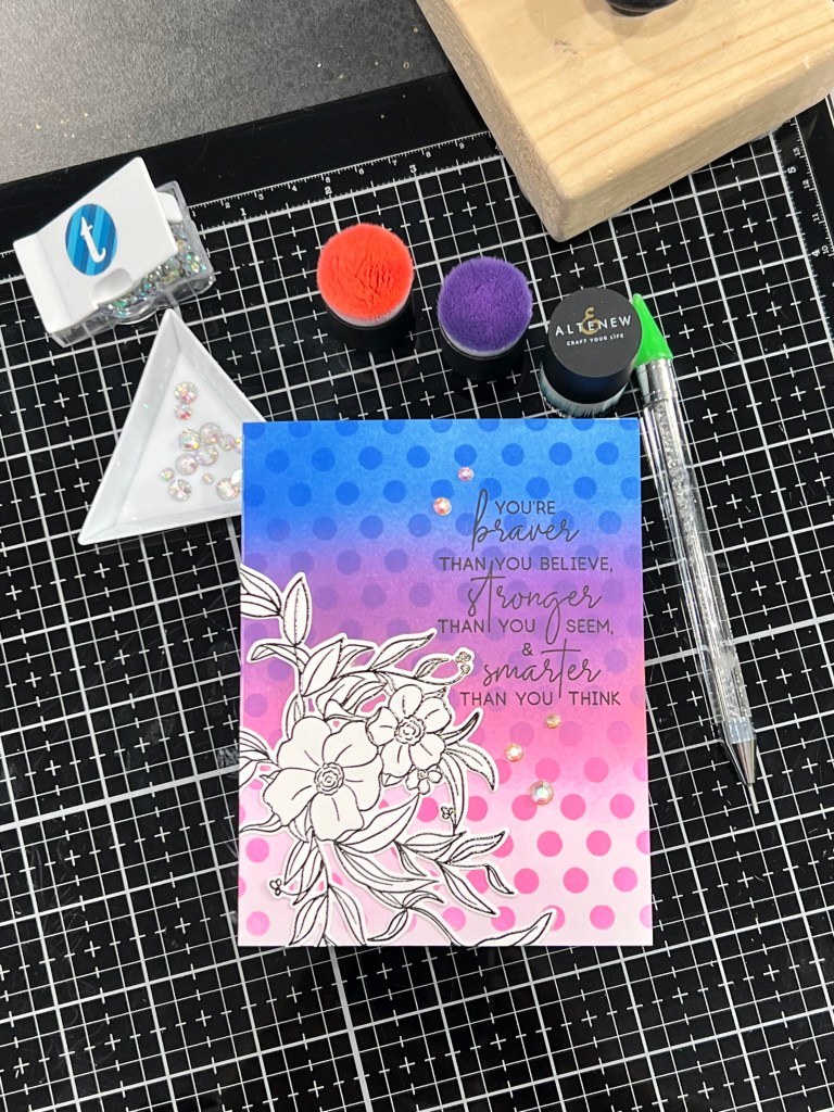 Using the Sparkle Bright stamp, die & stencil set and combing it with the Altenew Halftone Stencil and a sentiment from the Seasonal Blooms Bundle gave a fun card that makes the colours really pop. First I ink blended an A2 Top folding card front lightly with Ultramarine, then Deep Iris & Pinkalicious. I laid the stencil over top using only the larger dots and blended the same colours through it with a heavier hand and slightly overlapping onto the next colour for a blend.
