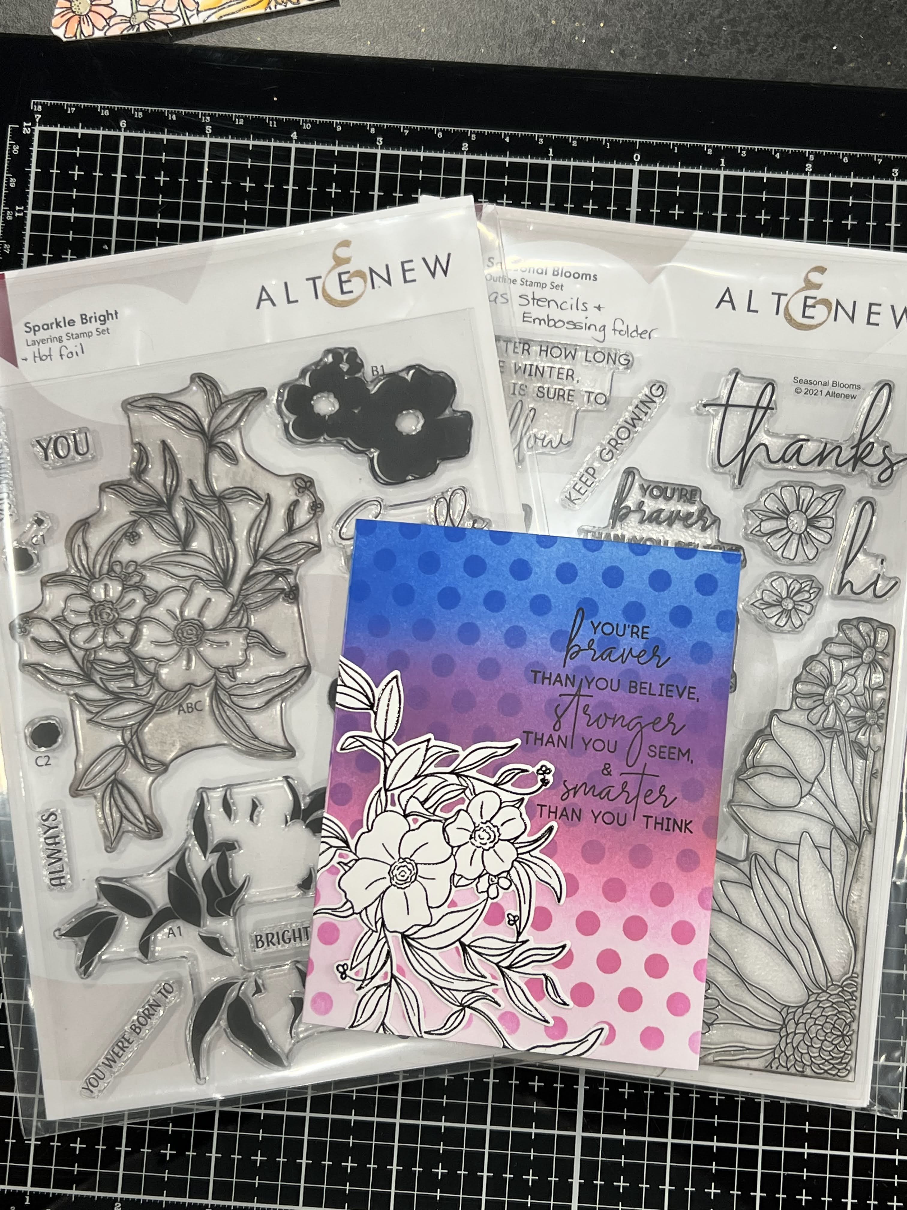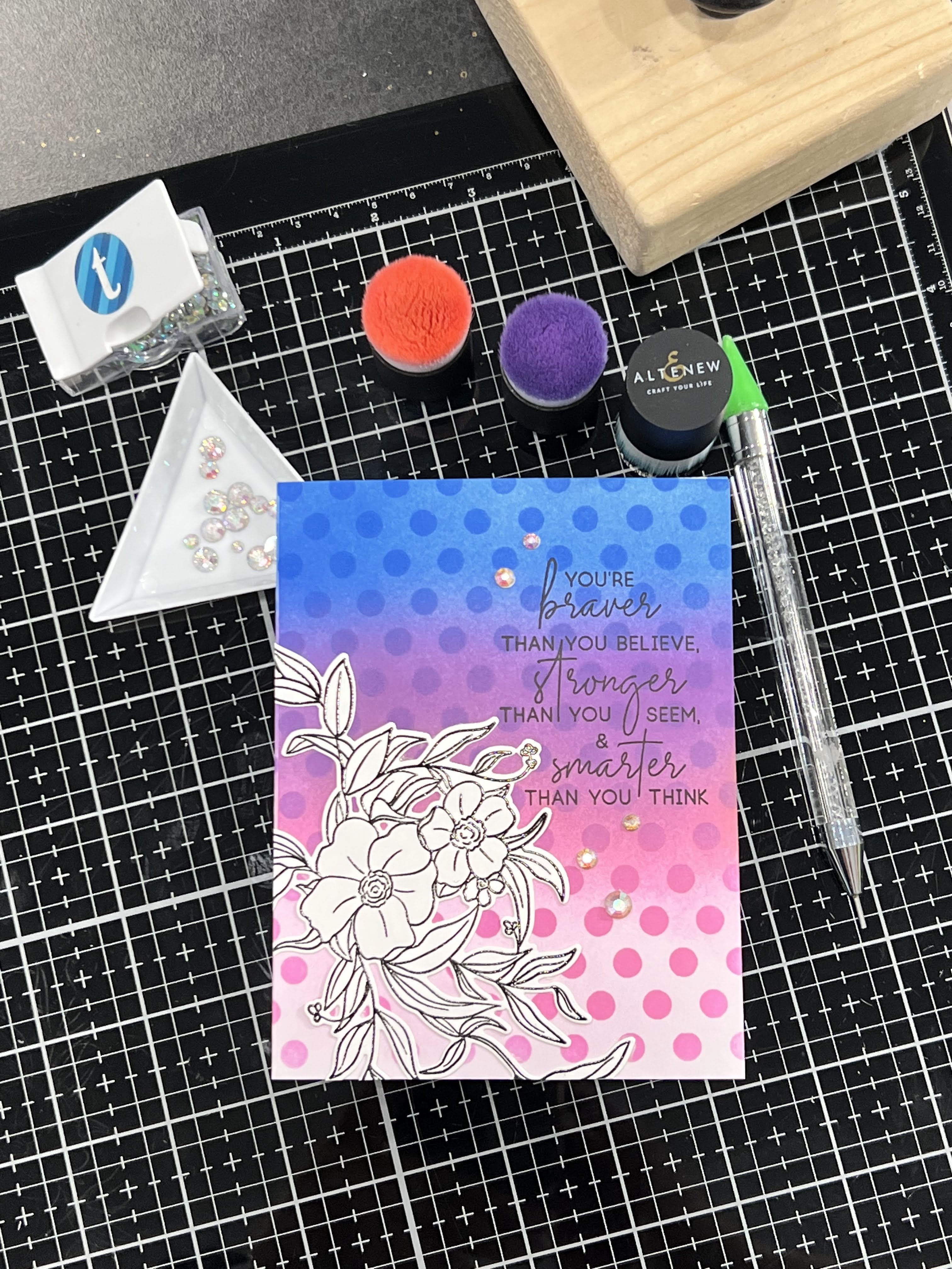 Using the Sparkle Bright stamp, die & stencil set and combing it with the Altenew Halftone Stencil and a sentiment from the Seasonal Blooms Bundle gave a fun card that makes the colours really pop. First I ink blended an A2 Top folding card front lightly with Ultramarine, then Deep Iris & Pinkalicious. I laid the stencil over top using only the larger dots and blended the same colours through it with a heavier hand and slightly overlapping onto the next colour for a blend.