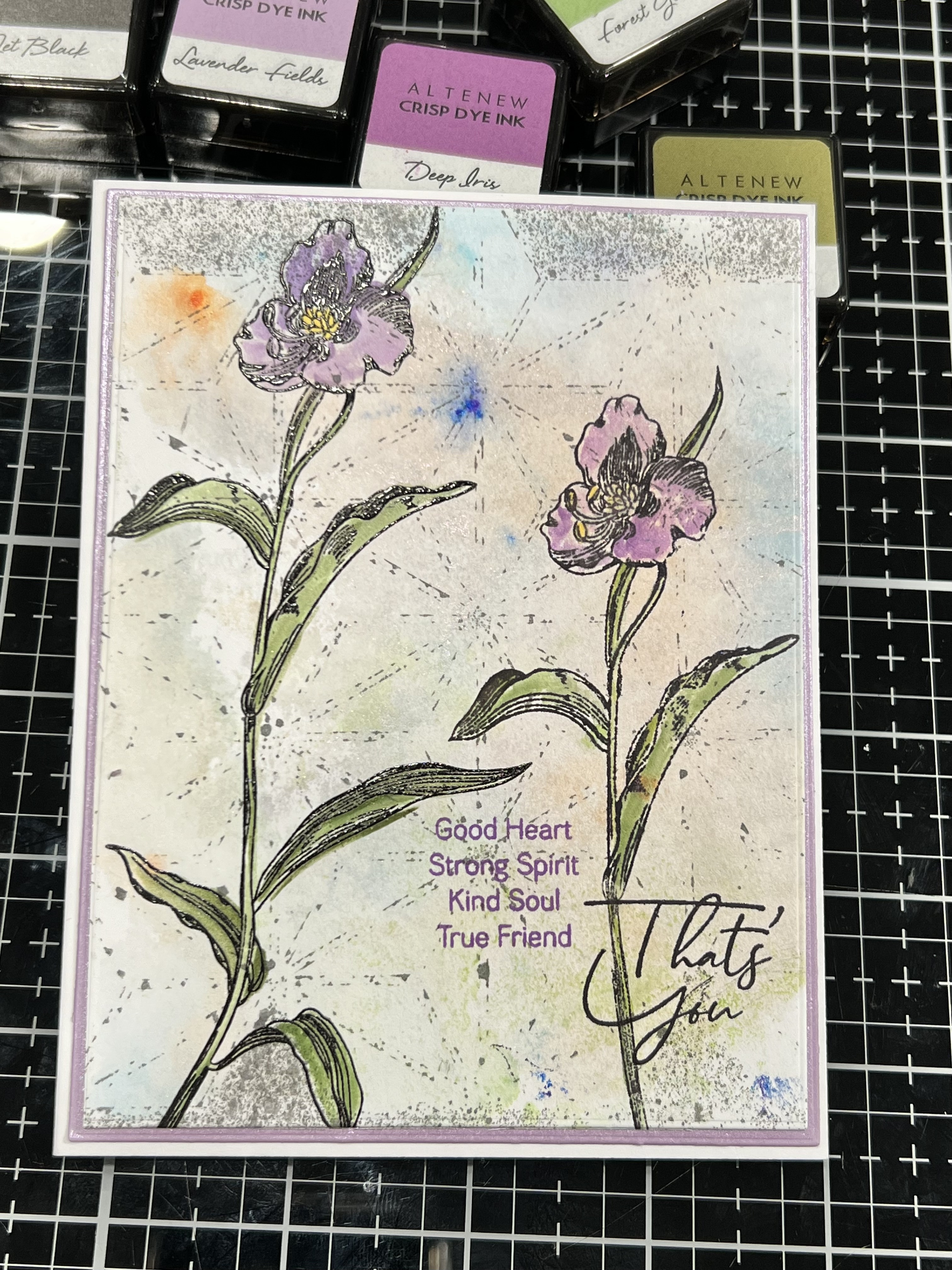 I stamped the images with Versafine Onyx Black ink and then embossed with a fine detail clear embossing powder from Simon Says Stamp. Using clear embossing keeps me from smudging the ink and helps keep me in the lines when painting! I used my glass mat as a palette and smooshed down Altenew’s Crisp Dye Inks in Lavender Fields, Deep Iris, Forest Glades & Moss, added a spritz of water, and painted in the images with the ink.