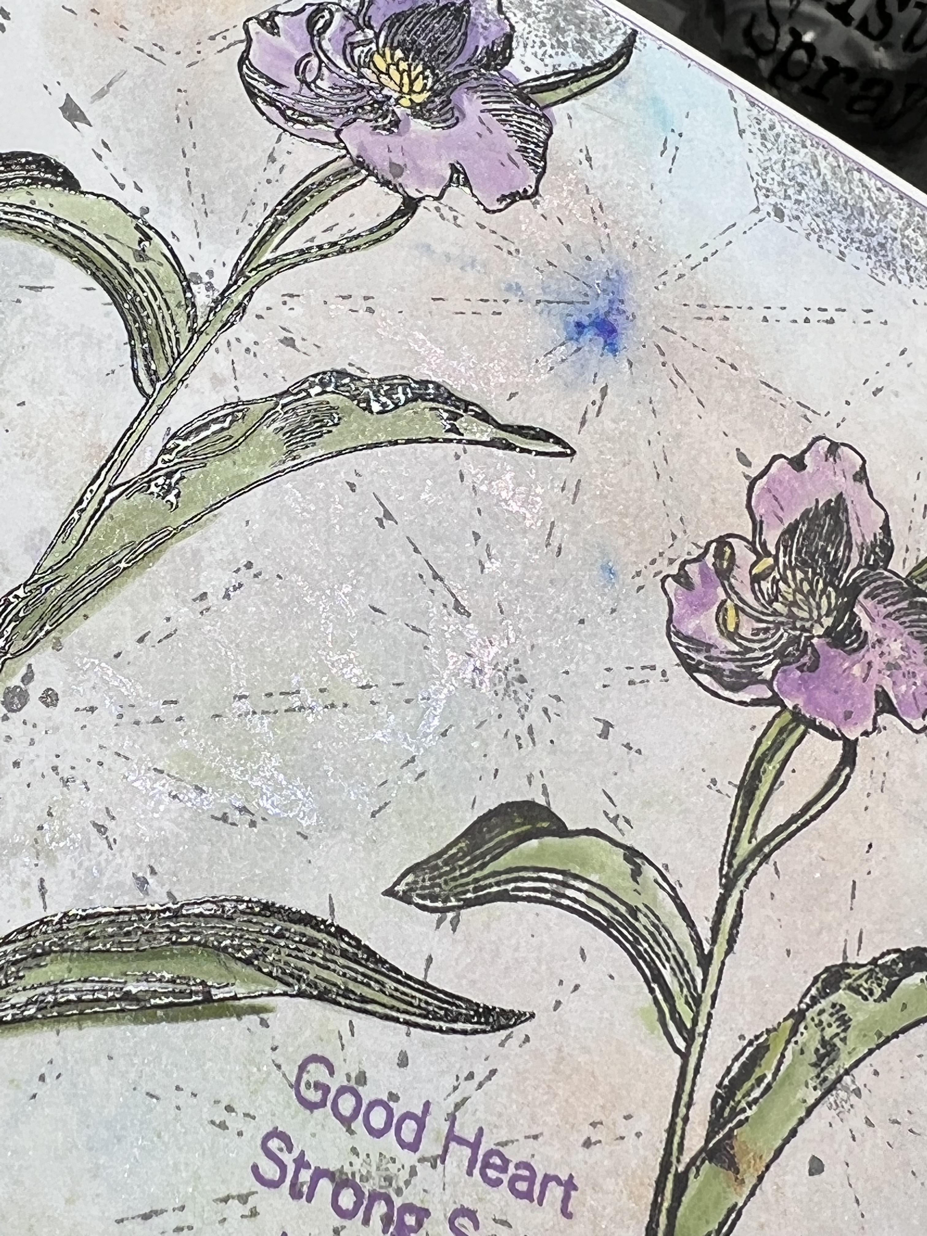 I stamped the sentiments from the Tall Foliage Set after the painted images dried, using Deep Iris and Jet Black. Tho it’s hard to capture with a camera the background has a lot of shimmer from using pigment powders when the gel print was made so I didn’t feel the need to add any extra bling, since I wanted the painted images and background to be what would draw the eye. I matted it with a 1/16″ of Purple Shimmer paper to tie the colours together.