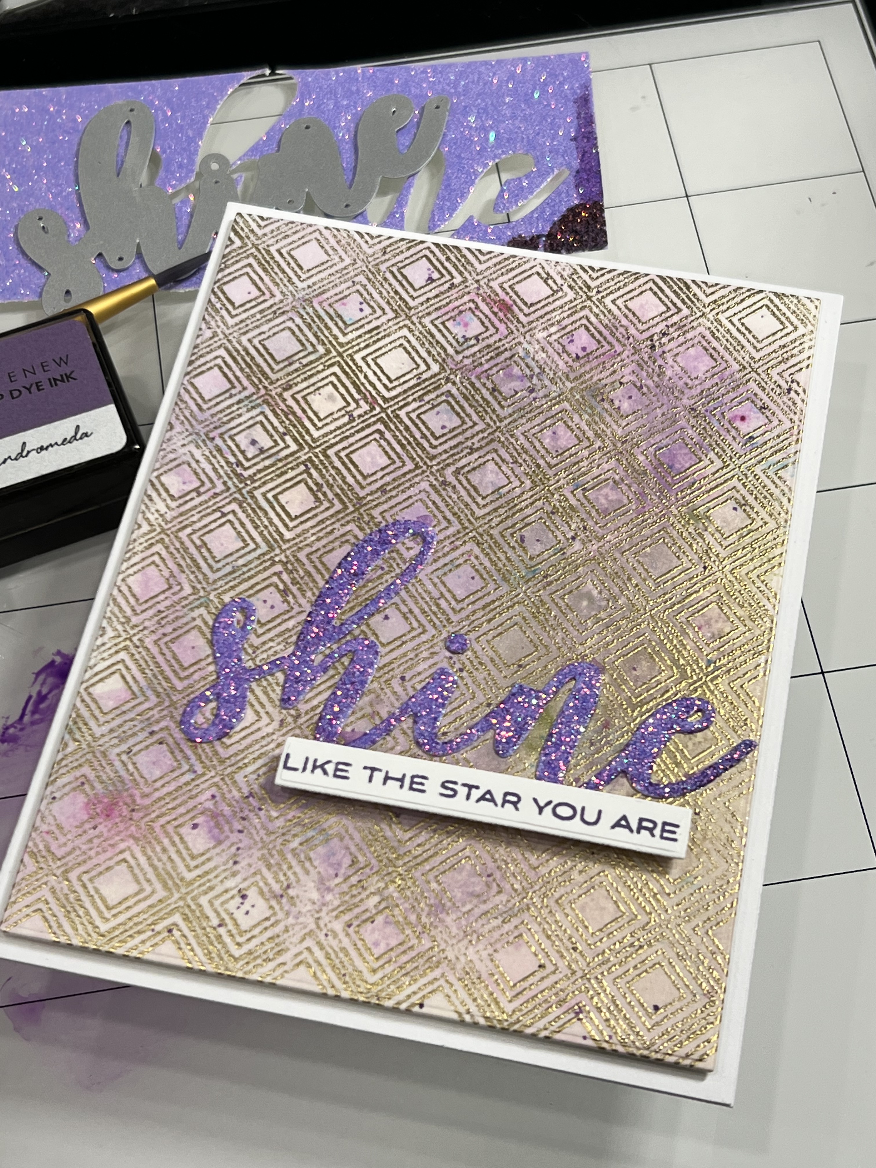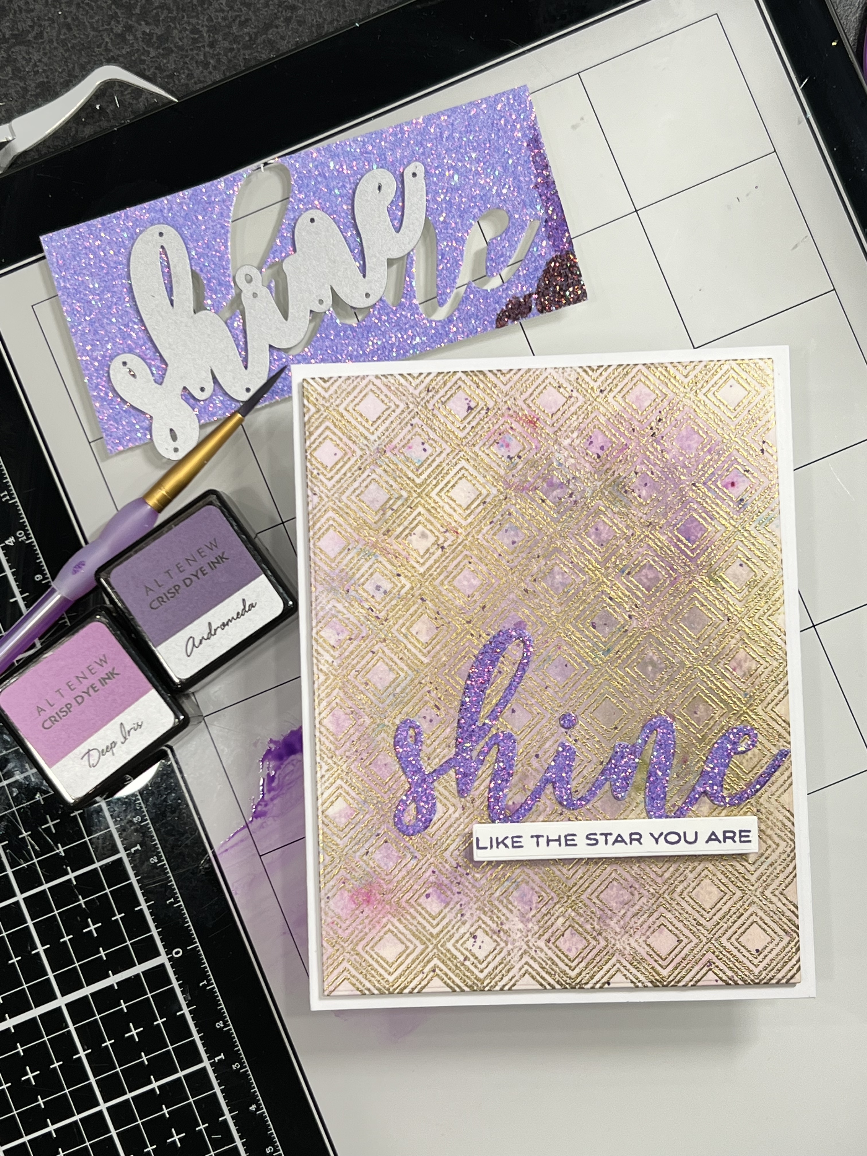 AECP’s Class 9 is call Let it Shine and that just called to my happy inky glittery little heart! So for this card I had to pull out some of my favourite techniques. I started with a 5 1/2 x 4 1/4 piece of Cannon XL Watercolour Paper and did some fun smooshing on my glass mat with Deep Iris & Andromeda Crisp Dye Inks from Altenew. I added a sprinkle of Lilac Waterfall Shimmer Powder from Nuvo and a spritz of water to activated it after the inks had dried. I set the panel aside to dry and worked on the die cut word and sentiment strip .