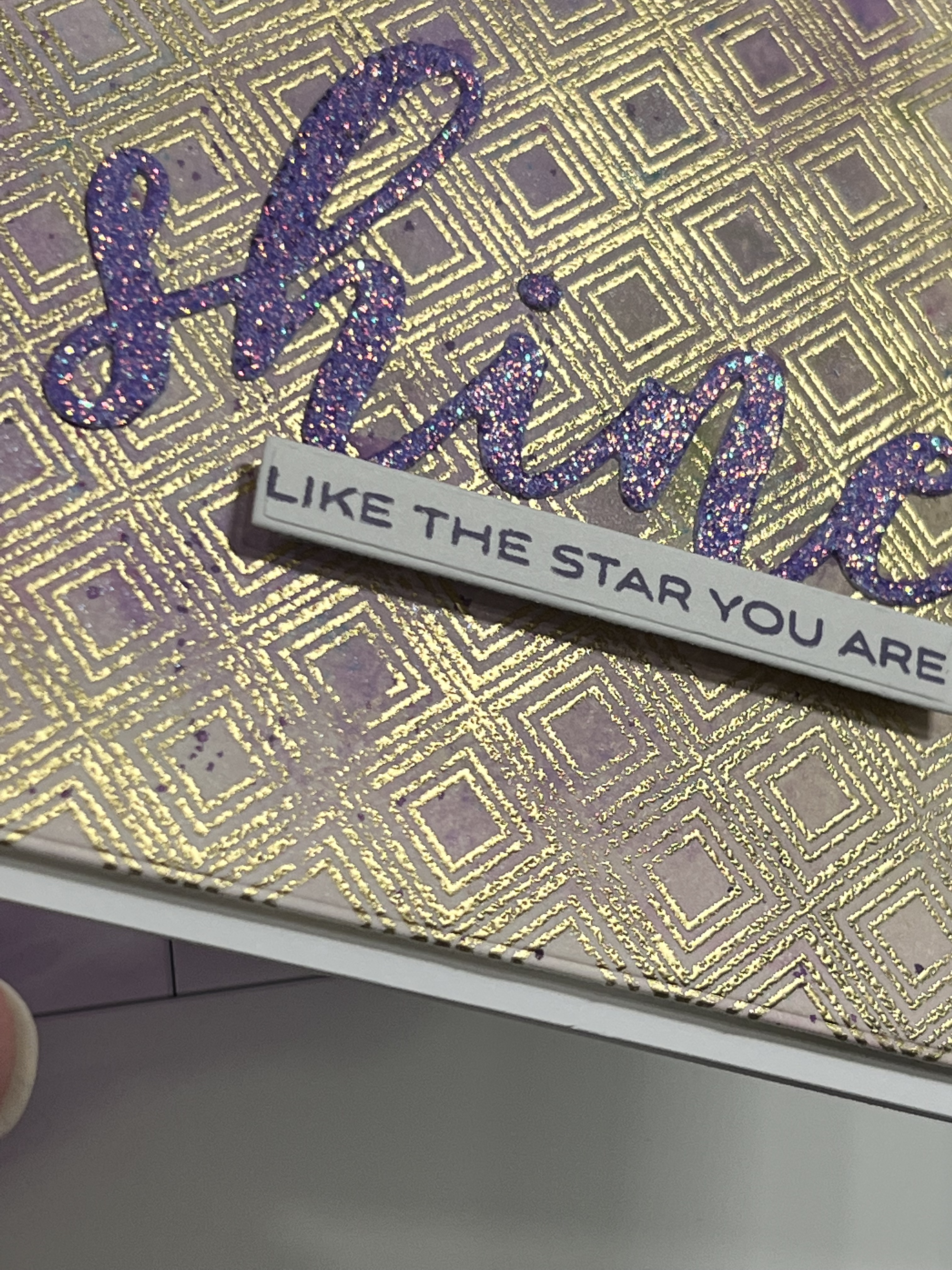 I used Altenew’s Shine Like a Diamond Stamp and coordinating Die set in a few different ways on this card. I took some Recollections pale purple glitter cardstock and inked it up using the left over ink on my palette and a paint brush, to match the base colour in the panel and the inked sub sentiment strip. I cut the large word die from the set out using my Big Shot and set it aside. I inked up the sub sentiment from the stamp set using the Andromeda ink and cut it out with an MFT sentiment die.