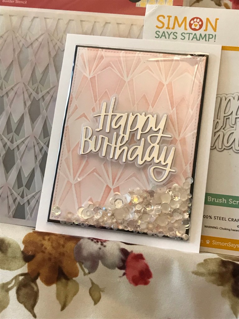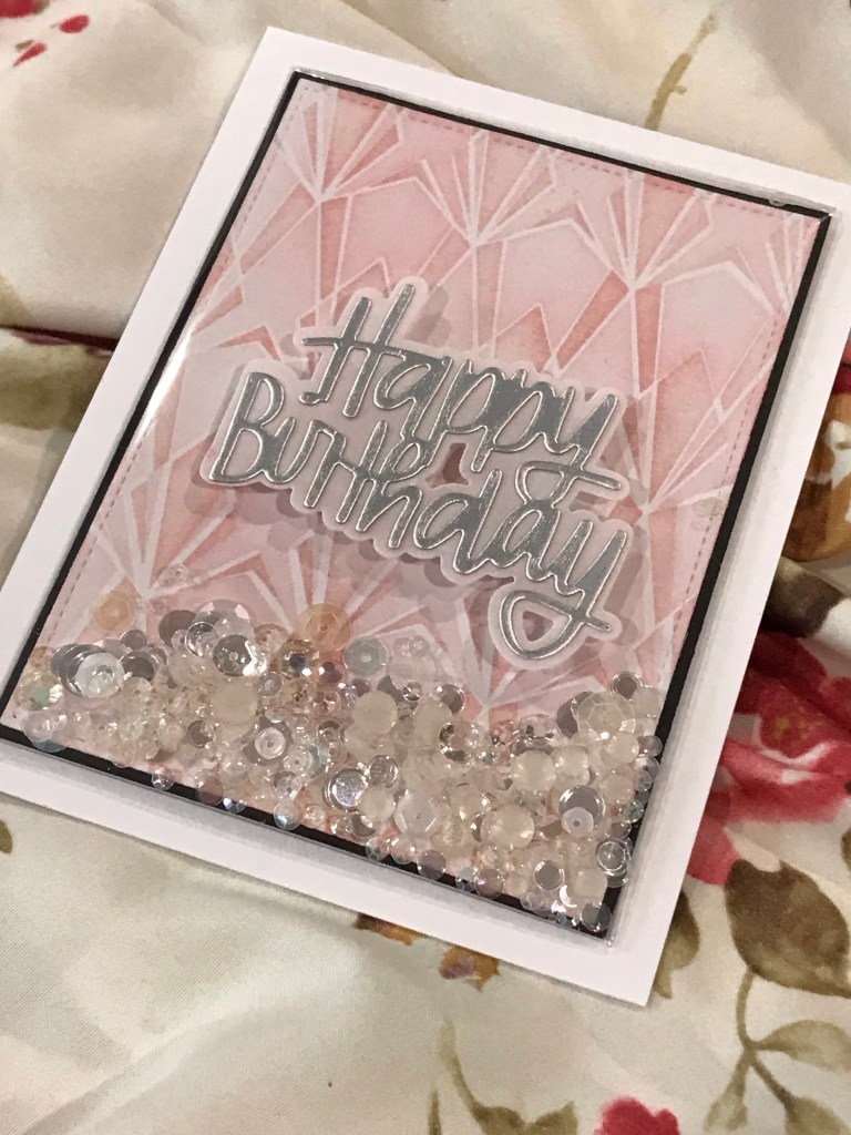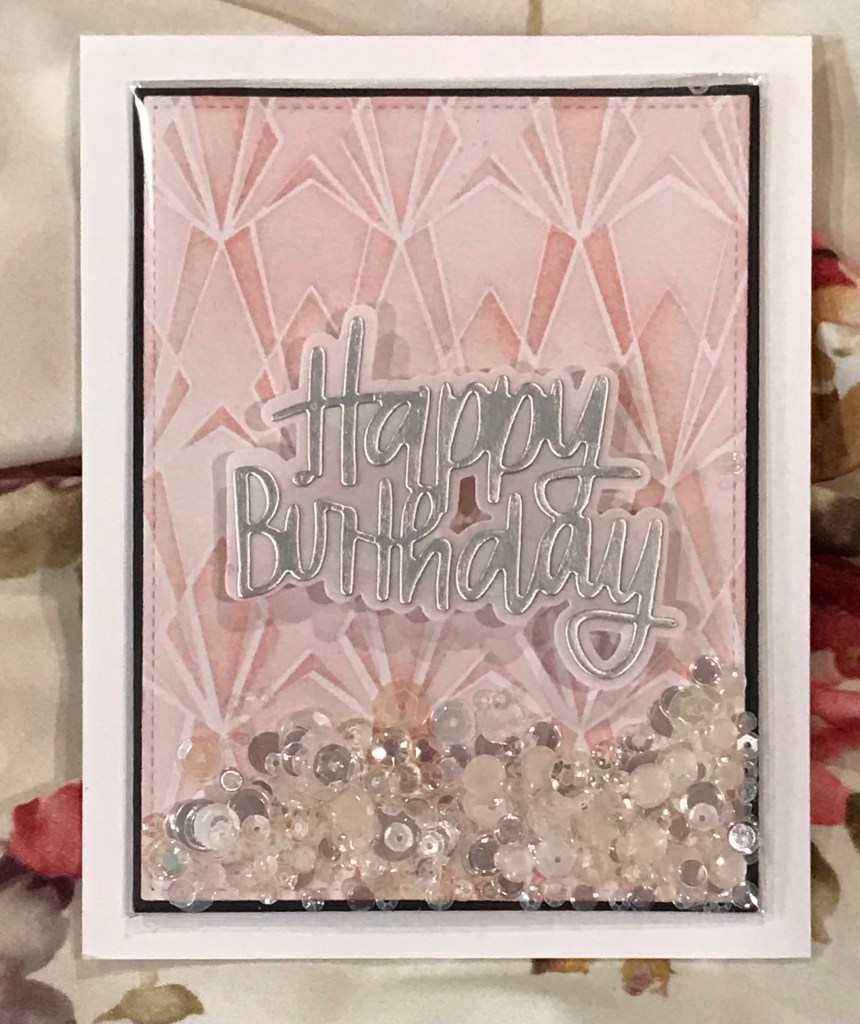 For this A2 top folding card I started with a 4 1/4 x 5 1/2 piece of Neenah Classic Crest Solar White in an 80lb weight. Using Rouge and Crimson inks I blended the two layers of the Deco Diamonds stencil. I really loved the soft retro feel that was created. Using the 3 5/8 x 4 7/8 die from the Additional Layering set I cut a black mat for the 3 1/2 x 4 3/4 blended panel. I created a full shaker front for the panel, using repurposed packaging and filled it with the 3 kinds of sequins listed in the supply list above. I used a strong double sided tape to attached the acetate to the panel and to attach the panel to the card. My favourite tip for adding panels to card fronts is to only peel back a small part of the tape from each corner, once you have placed it down you can then peel off each strip easily. This tip really helps me get great placement. I cut the Happy Birthday die from matte silver cardstock and the shadow layer from velum. I find this allows the background to shine and yet let’s the sentiment show nicely. I attached the sentiment to the card front with a velum tape runner from Creative Memories then added it to the Accent Opaque card front.