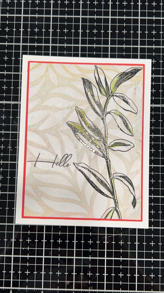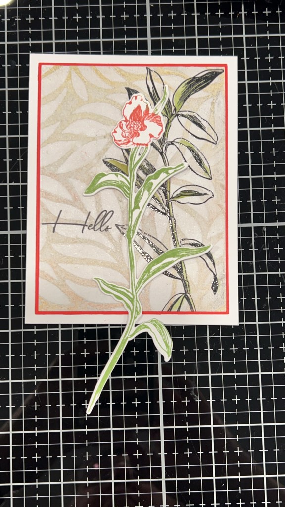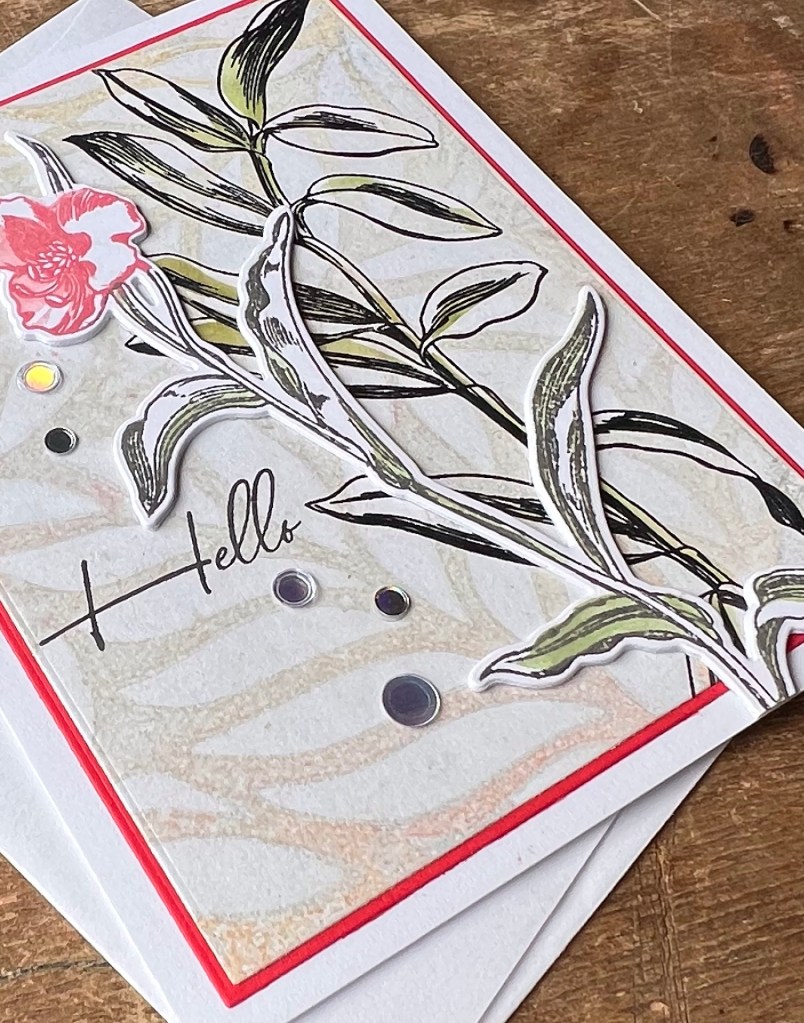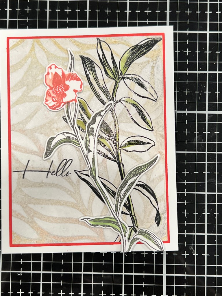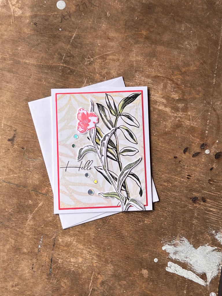 To make this A2 top fold card I started with a negative print made on a gel press using Sand Dunes and Caramel Toffee inks and some Arteza metallic bronze paint. I tend to make dozens at a time when I pull out the gel plate, inks and paints using either Neenah Classic Crest 80lb or Hammermill 100lb cardstock. I cut the panel to 5” x 3 3/4” using a WaffleFlower A2 Layering set. On the panel I stamped the stem from the Altenew Tall Foliage set in Altenew Jet Black ink and clear heat embossed it immediately. Using the matching stencil set I ink-blended the stem with Forest Glades ink. I matted the panel using Creative Memories red cardstock cut to 5 1/8” x 3 7/8” using the Waffleflower Additional A2 Layering Set and centred that on an A2 card base made of Accent Opaque 100lb cardstock. I then stamped the floral stem from the same set and ink blended with Rouge, Crimson and Forest Glades inks. Cutting it out with the matching die I placed it on the front loosely so i could position the Hello stamp from the same set and stamp it in Jet Black ink as well. I made 2 blank die cuts of the same flower from scrap cardstock (recycling paper this way) that had miss stamped images on it. I do this to create dimension by gluing together several layers. This was attached it to the card with Art Glitter Glue liquid adhesive. I intentionally placed it in such a way as to go past the edges of the top panels for added interest and texture. A last touch is a bit of bling scattered around the sentiment. I love the Moonshine confetti because it goes with almost everything!