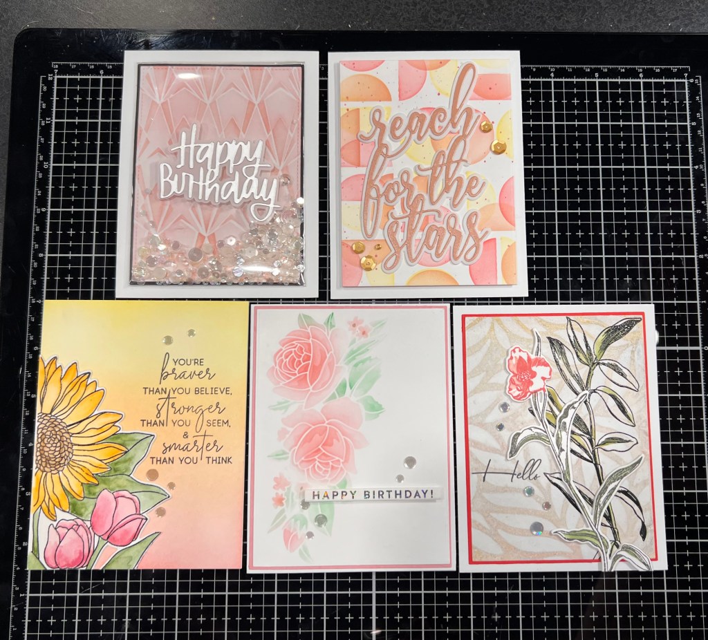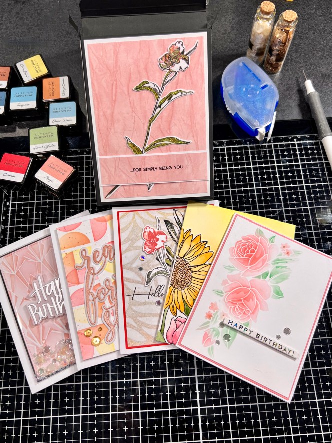The first set I’ll show you is the feminine set. I’m very spoiled for choice with my inks as I have almost all of the Altenew Ink Collection. But I really loved the idea of a fun palette of colours to tie it all together and make each card unique within it. You can find part two here