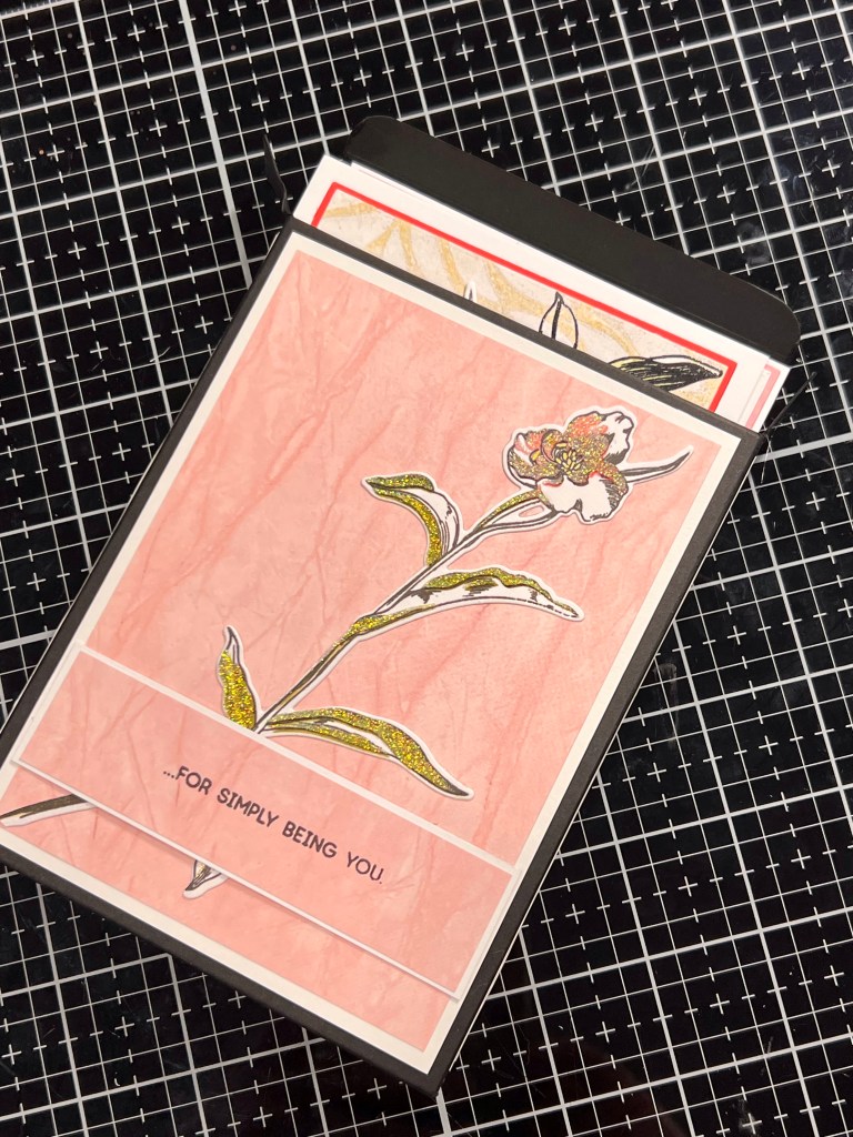 • I tried a few other box ideas with recycled materials but I just wasn’t happy with the clunky feel of what I came up with. So like any sensible crafter off to YouTube I went! I’m so glad I found this amazing Gina K video because I knew I’d be able to follow her directions and make something iI would be happy with. Here is the link https://youtu.be/bLY19gWt5Gs to her video. I made a few small adjustments to my notes as I did try a couple of practice pieces first. I used one of the Tall Foliage stamped and die cut pieces for the front of the box to tie the theme together. I stamped a sentiment from the Inside and Out : Thanks on the patterned paper and matted it on white cardstock. The measurements for this part really are whatever works for your sentiment and final look you want to achieve.