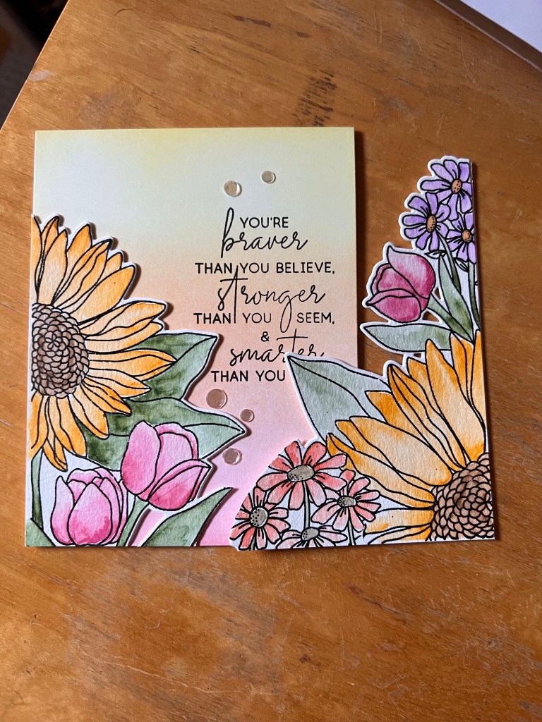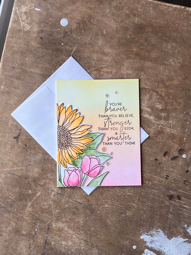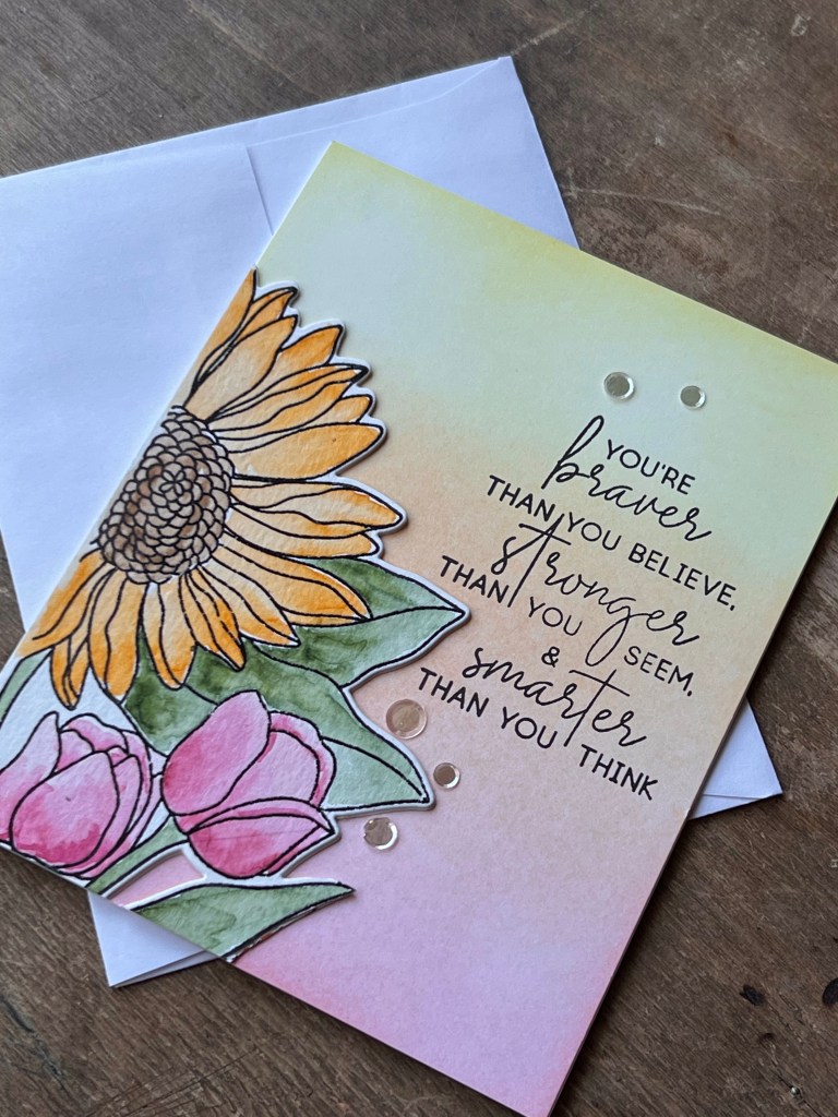 This card may be one of my favourites quite honestly. I love how well the Altenew inks blend and soften. This is an A2 top folding card that was made in three parts, the floral watercolour, the blended panel, the stamped sentiment and final touches. I stamped the floral image on some Canson XL watercolour paper with Versafine ink, sprinkled clear embossing powered over it and melted it with a heat tool until shiney and melted. I then did some simple painting with the Altenew watercolour paint set and set it aside to dry. Using a 4 1/4 x 5 1/2 inch of 80lb Neenah and the large blending brushes, I did a soft blend of inks to mimic the colours on the painted piece. After die cutting the floral piece I fussy cut it apart to create two pieces. I cut a second piece from scrap cardstock to layer it up for dimension. Before I attached it to the base I played with positioning for the sentiment (this is where a stamp platform is so dang handy!), once I was happy with placement i stamped the sentiment form the same set with Jet Black ink. I attached the floral piece with liquid adhesive and trimmed off the excess with a pair of sharp, long bladed scissors. Using my Misti I put the card base into a corner and line up the finished panel into the same corner so they match up perfectly. This is a handy way to line up a full panel on a card base and not get bits that hang off the top edges! The final touch of course is a bit of bling with some Moonstone Confetti.