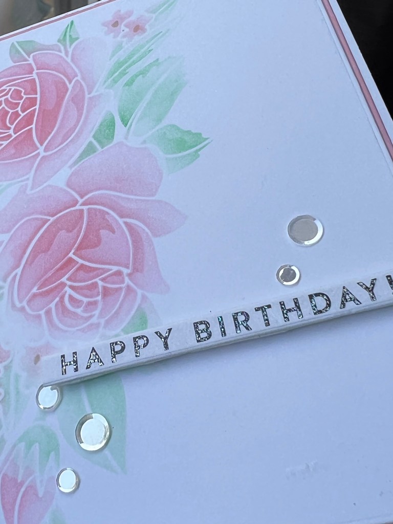For this A2 side folding card I was aiming for a clean and simple look that was on the elegant side. I kept the colours very soft by ink blending with the Altenew mini blending brush and a light hand. By masking off areas to keep colours separated and using the detailed brushes for small areas I was able to get multiple colours in open design stencil. I cut the blended panel with the 5 1/4 x 4 inch Layering die and cut the pink panel with the 5 3/8 x 4 1/8 inch die from the Additonal Layering set. Using a sentiment from the Bold Birthday set I foiled it with my laminator using some Gina K Silver Foil. The finishing touches are popping the sentiment up with some foam tape, adding some sparkle with the Moonstone confetti and adhering it to the Accent Opaque, A2 card base.