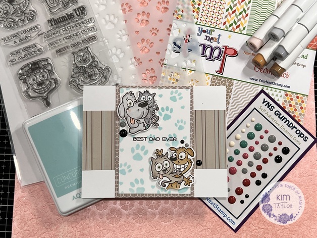 This A2 landscape fold card started with the cute critters in the Photo Booth Thumbs Up Stamp & Die Set. I coloured those with shades of grey and brown with my Ohuhu Alcohol Markers. The top panel is made using the Paw Prints Stencil and blending the Aqua Sky Ink Pad from Concord &9th over it. I used an A2 panel of Hammermill 100lb smooth cover for the task and cut it in half and matted it on a sheet of the YNS Geometrics 6×6 paper pad. The stripped panel across the middle is an old photo mat from my vast Creative Memories stash of paper. I just wanted to pull in the same colours in a complimentary pattern to tie things together. I stamped the sentiment on the panel with Versafine Black Onyx and then attached everything to the card front. I added the cute critters with some YNS Pop Dots and of course those fun YNS gumdrops for the extra touch!