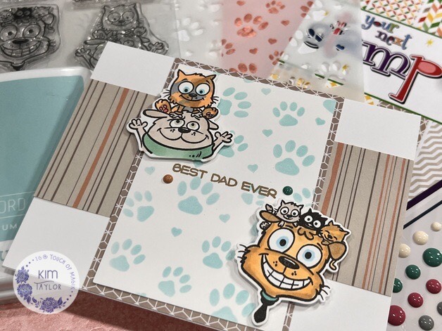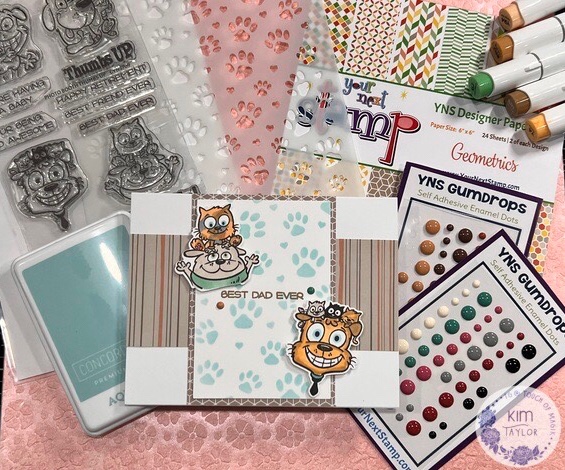 I love these products so much I had to make two cards! I ink blended the Paw Print Stencil on an A2 panel of Hammermill 100 lb cardstock and trimmed it down to 4″ x 2.75″ getting two pieces to make two cards. I wanted to keep the cards on the clean and simple side so that these cute critters from the Photo Booth Thumbs Up set really had a chance to shine! Accented with YNS Gumdrops from the Perfect Blend and Latte sets.