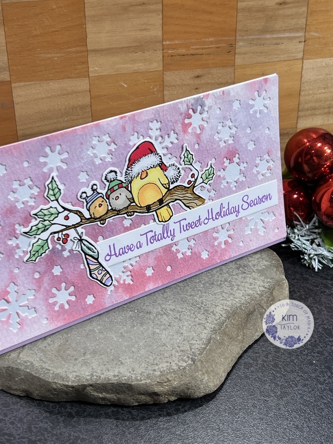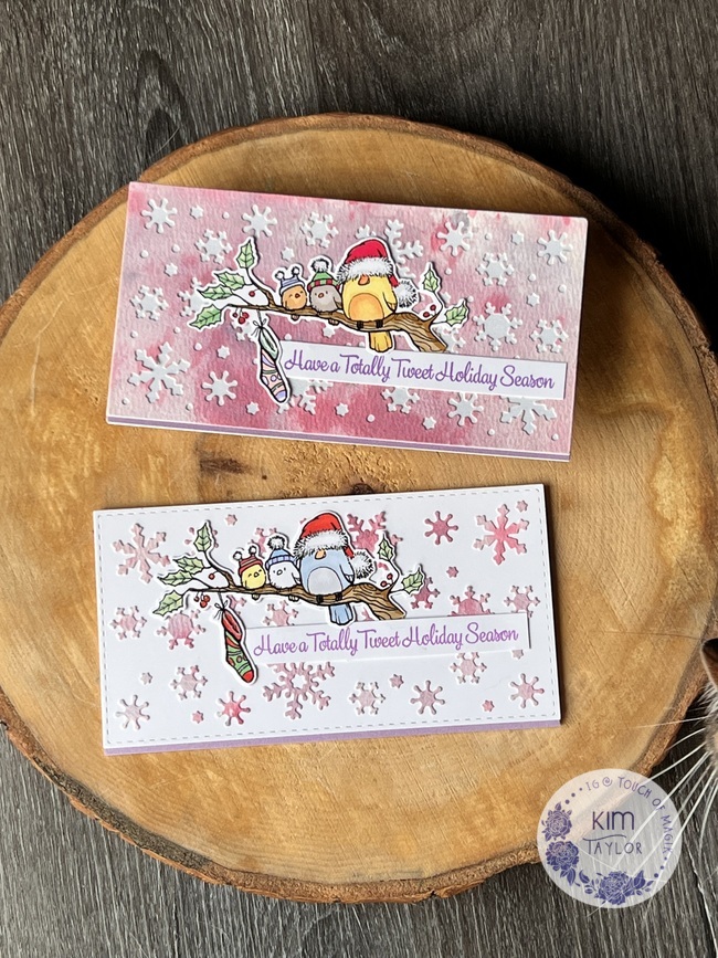 I coloured the image from the YNS Tweet Holiday Stamp twice with my Ohuhu Alcohol Markers and cut them out with the coordinating die. The sentiment is stamped in purple to tie in the colours from the background panel. I added a slim strip of purple shimmer along the bottom edge of the card then added the finished piece on top. I just wanted to tie the colours all together visually . The finished cards are 6 1/4″ x 3 3/8″