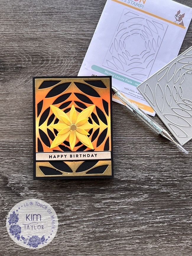 For this one I cut the front panel with the Nested Leaves Plate from 110lb Hammermill Cardstock. I ink blended that with Simon Says Stamp Pawsitively Saturated Inks in Lemonade, Cantaloup & Cappuccino from the centre out . I matted that on a heavy 100lb Black Cardstock base from SSS. The flower is made with the cutout pieces that I inked up with Lemonade and Cantaloup ink and a small gold circle in the middle finishes off my sunflower!
