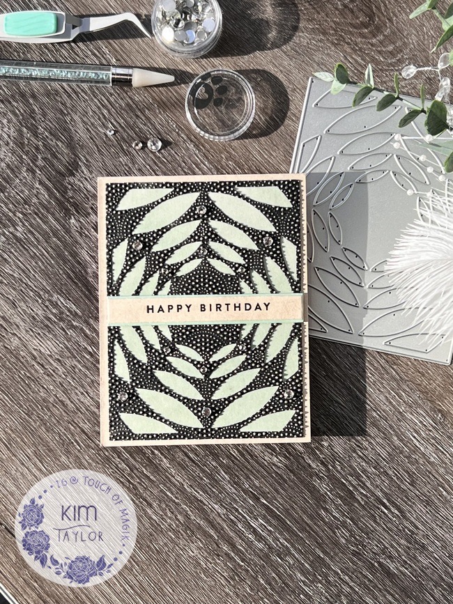 For this one I cut the cover panel from 100 lb Black SSS cardstock then gave it a light spritz and ran it through my Anna Griffin Empress with the Dibble Tile Embossing Folder. After that I ran over the top edges of the embossing with a Champagne Metallic ink from Tsukineko to highlight the texture of the folder. I backed it with velum that I coloured with Simon Says Stamp Pawsitively Saturated Ink in Sage. Set it on a Neenah Desert Storm Cardbase and topped it with a few of the new Clear Pawsitively Dazzling Gems, also from Simon Says Stamp