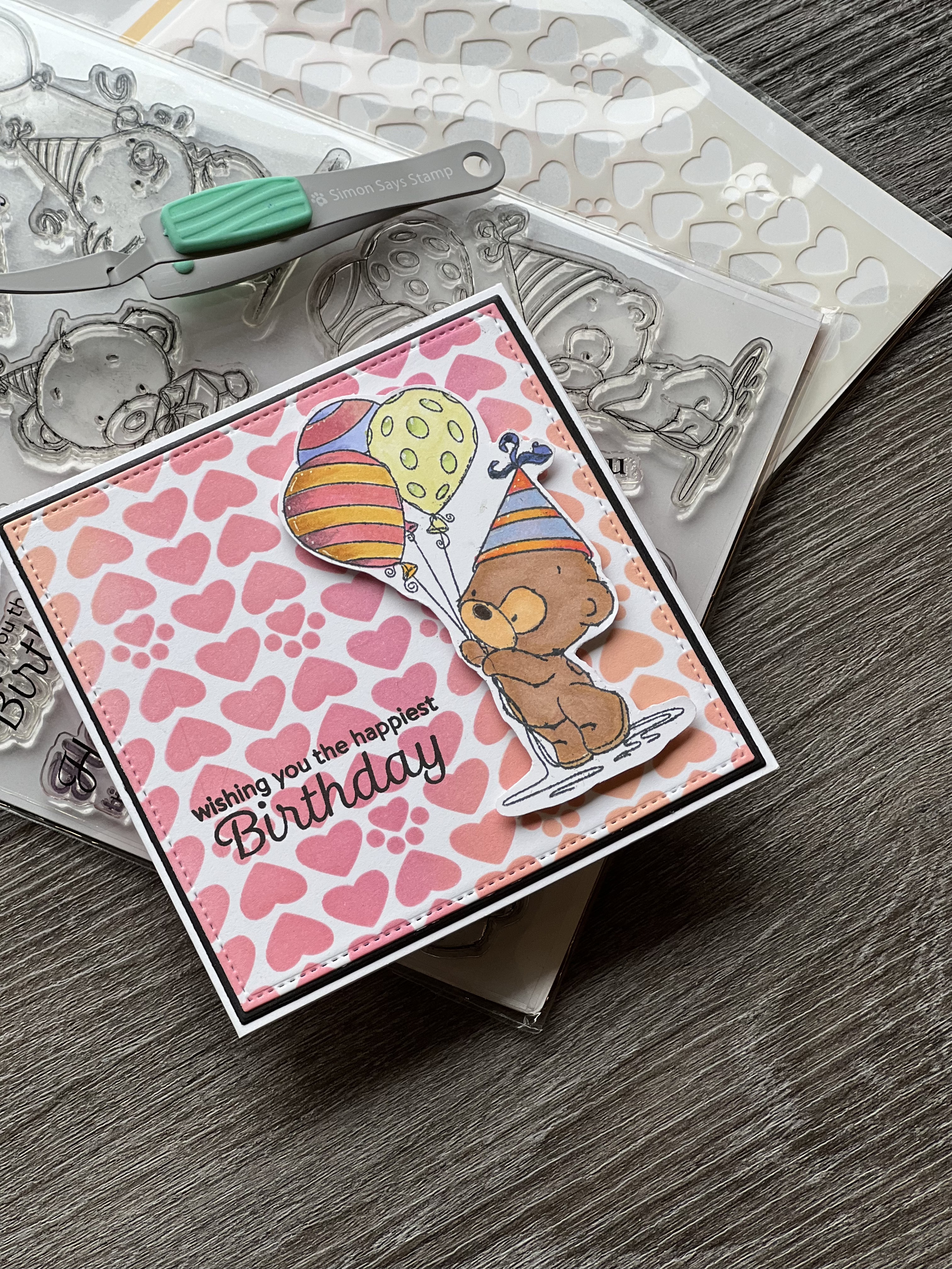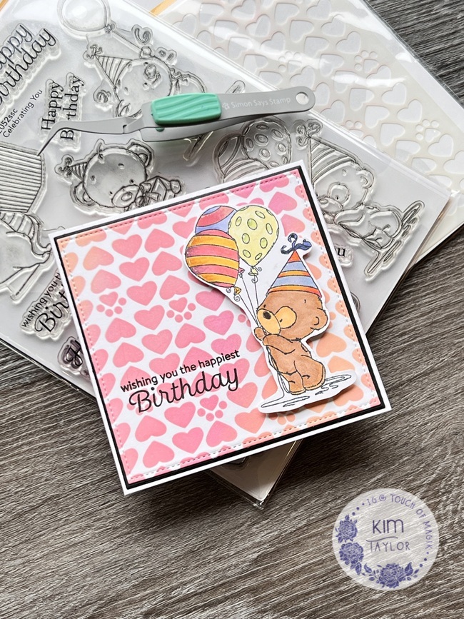 The sweet little bear needed some paw prints so I used the Puppy Love Stencil from the Smitten release with Pawsitively Saturated Inks in Cheeky, Carnation & Peachy. I don’t do square cards very often but I am really happy with how the size worked with the image and stencil to make a sweet wee scene.