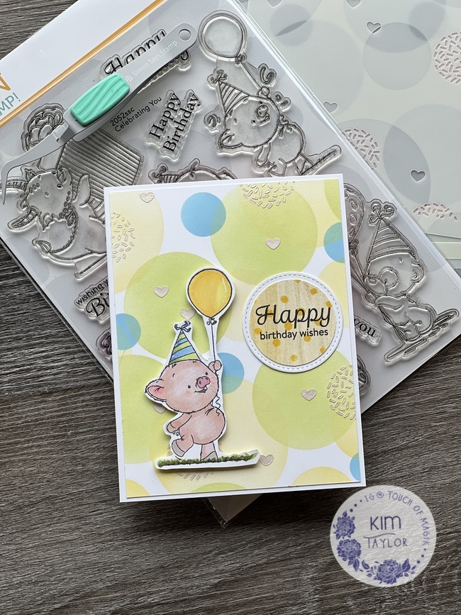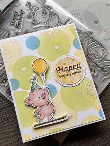 For this A2 sized card I paired the cute little piggy with the SSS Layered Dots Stencil using Pawsitively Saturated Inks in Lemonade, Marine & Celery. I did use an embellishment paste on the last layer of the stencil for some shine and dimension. Even tho fussy cutting isn’t my forte these were not hard to do at all!