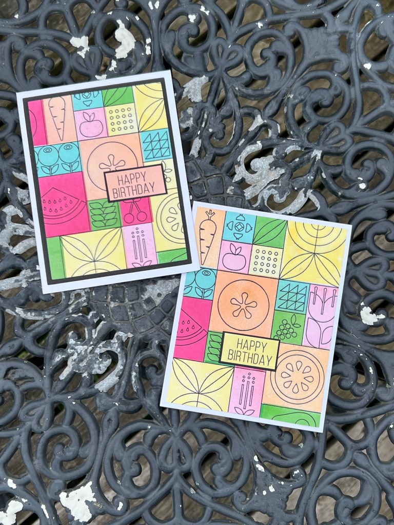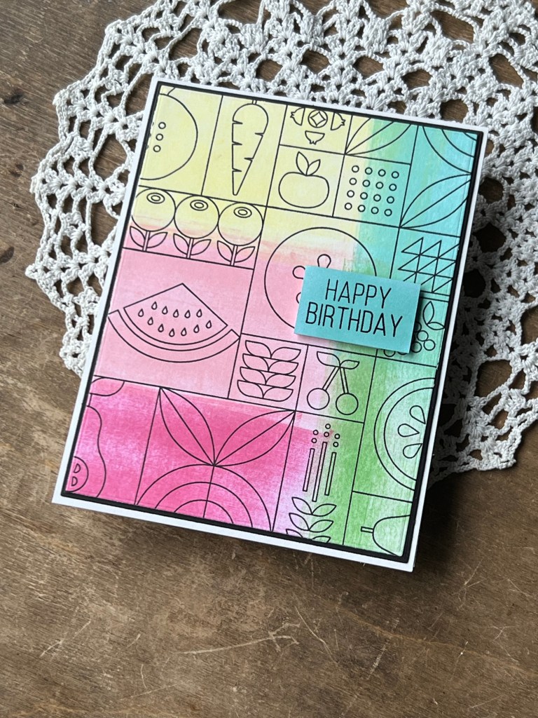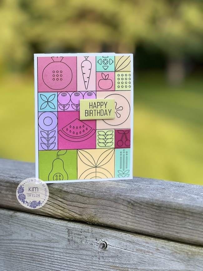 I received the Summer Fruit Tiles Stamp set and hard to force myself to stop at 6 samples to send in! The possibilities are nearly endless! But for this first card I went with a traditional ‘use it as is’ approach.