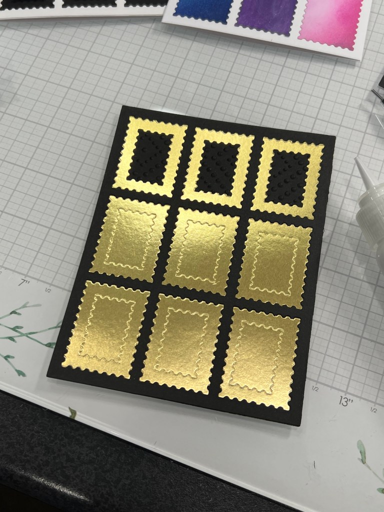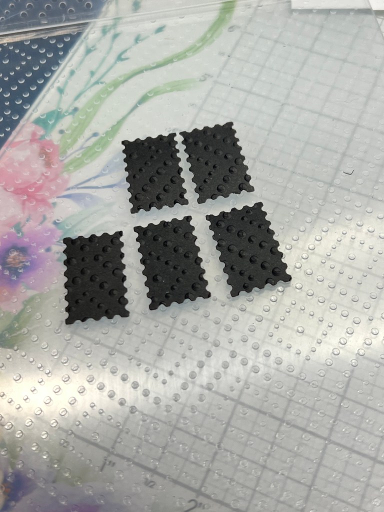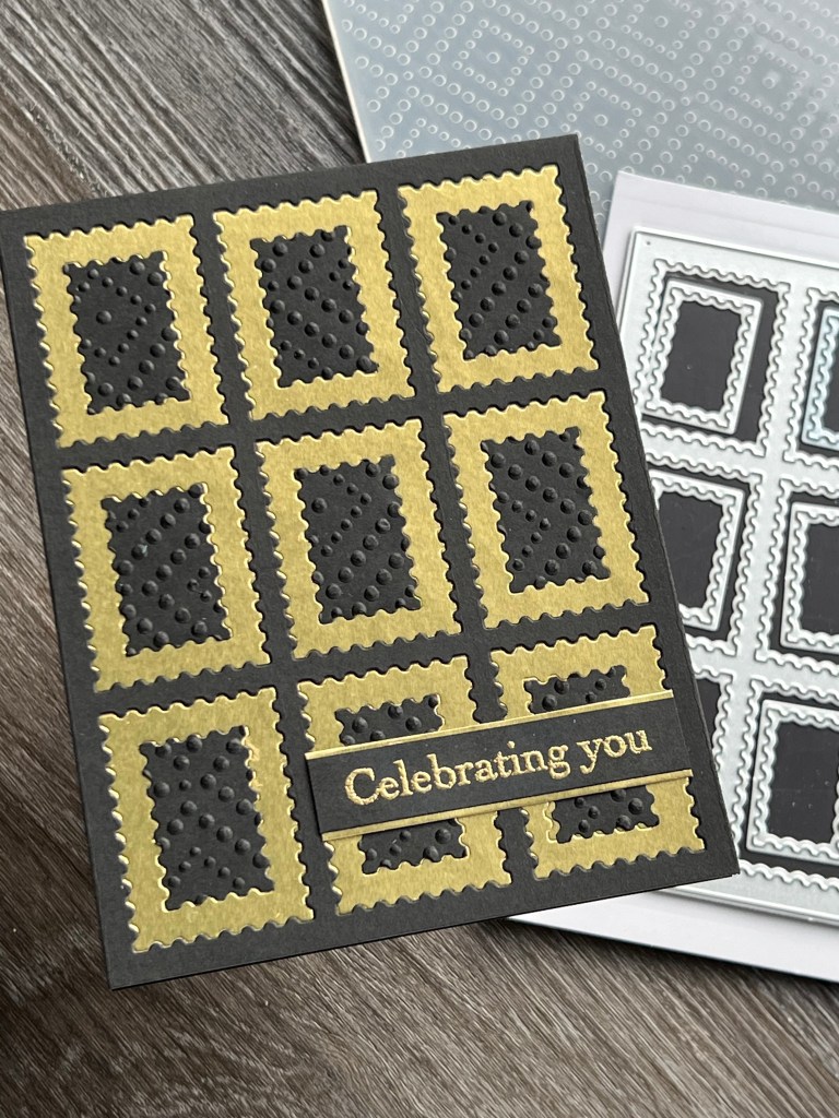 I also cut the small inner postage dies from the same black cardstock and then ran them through and embossing folder to add the dot texture !!
