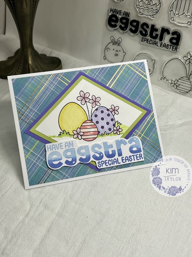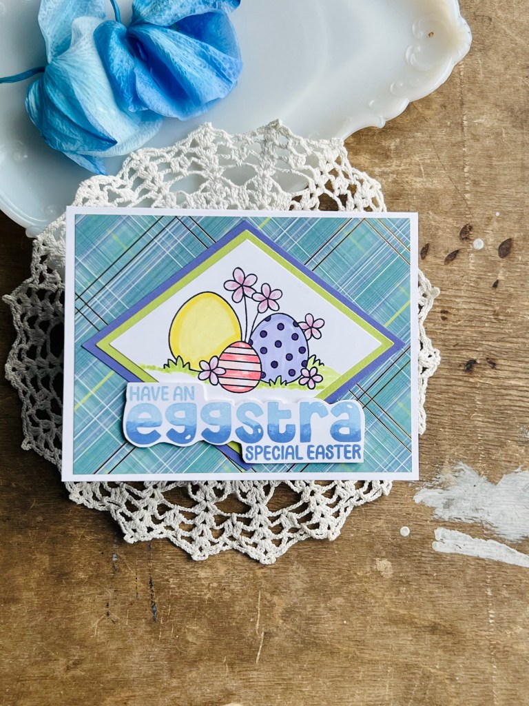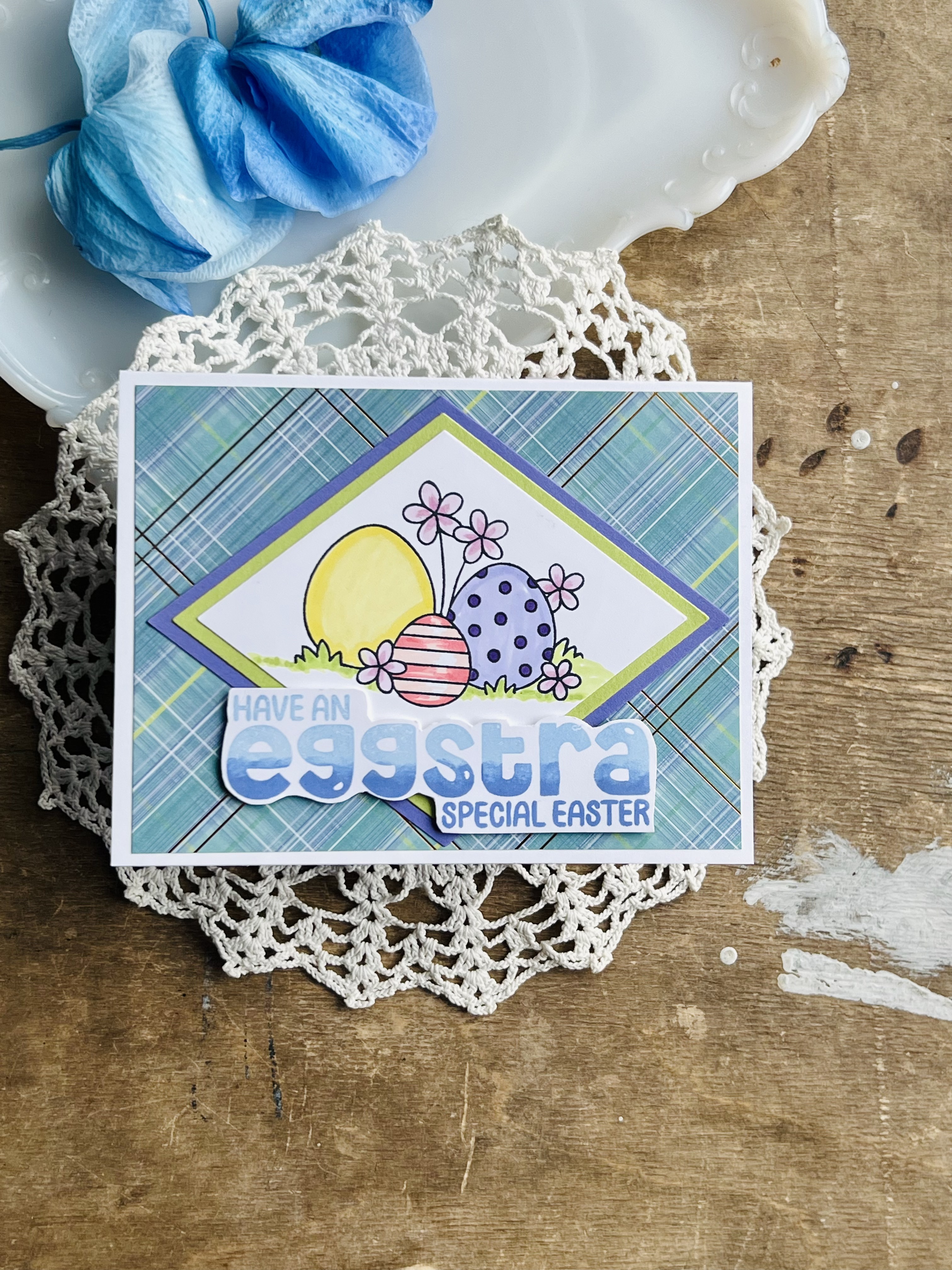 Card two is made with some fun patterned paper and a diamond dies and the cute egg image from the stamp set. The sentiment was ombre embossed and then fussy cut.