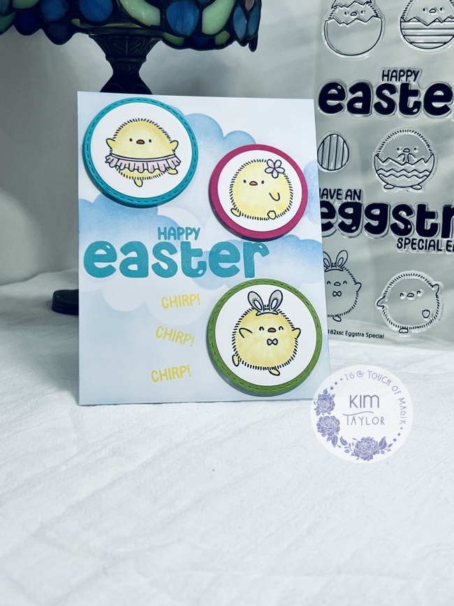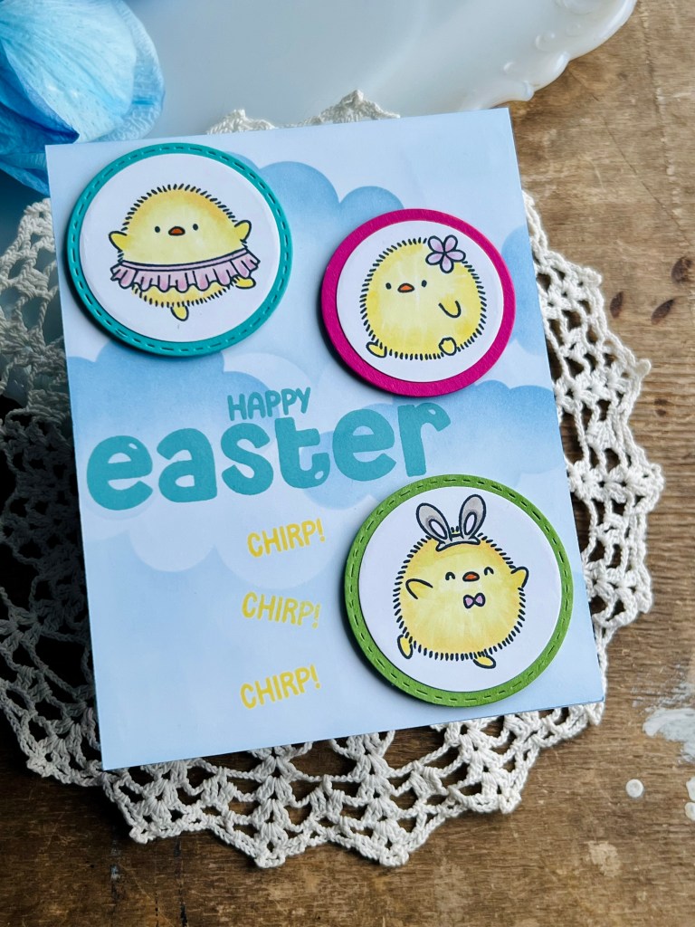 I had fun making two cards with this set and I can’t wait to be able to buy the dies and play even more! The first card I coloured with my Artist Markers then die cut with circle dies and layered them up with fun Spring colours. The sky background is made with the Simon Says Stamp Clouds for Days Stencil and shades of blue inks from the Pawsitively Saturated Line.