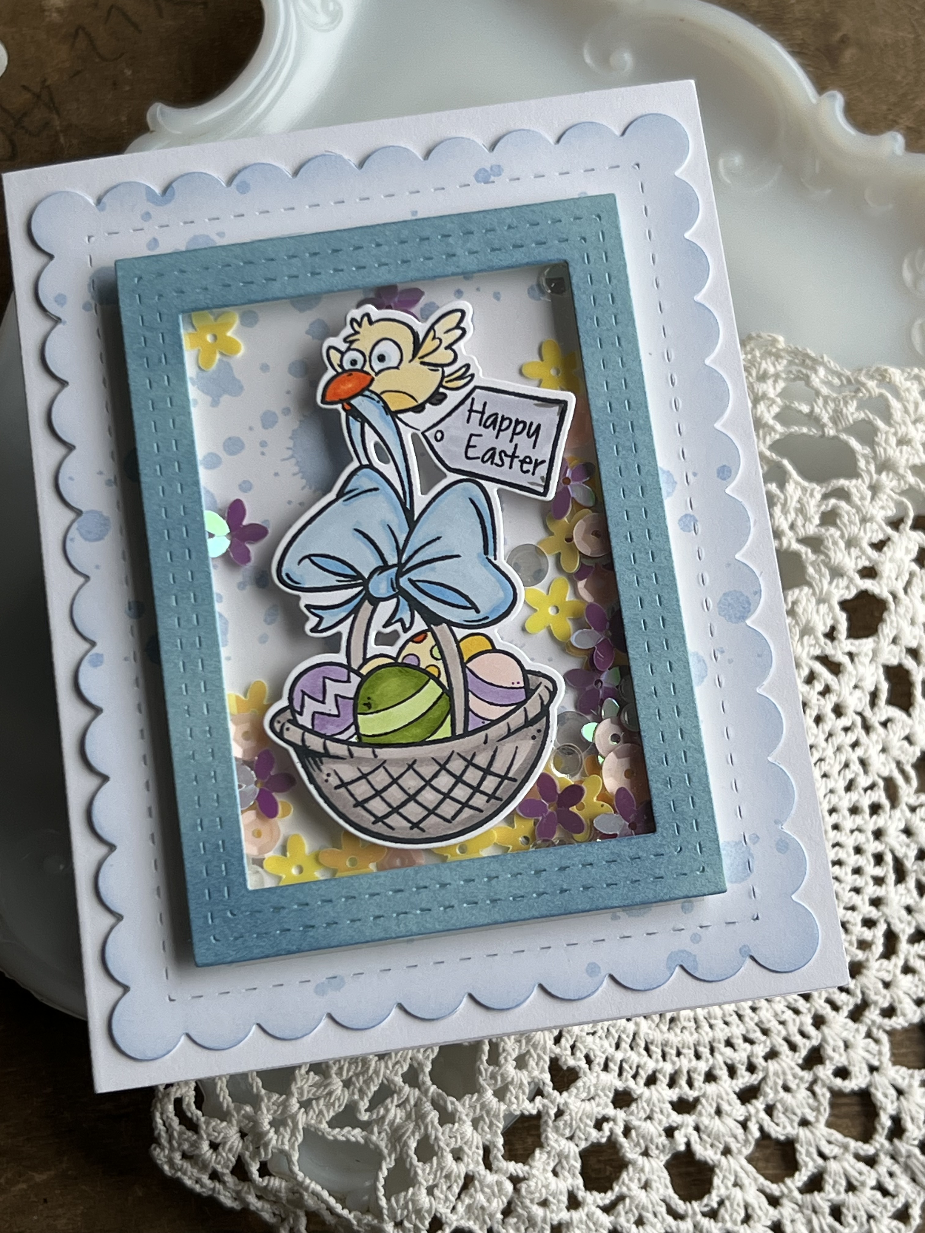 For this I added acetate behind the blue frame and then popped it up with foam tape. The shaker bits are some fun spring flowers from my stash mixed with regular shiny confetti!