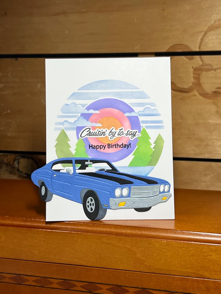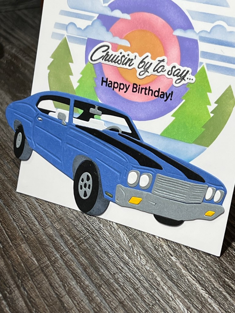 I used the **Muscle Car die set S4-1443 and the **Scenic Drive Layering Stencils STN-104 I used Hero Arts inks for the stencil and Spellbinders Colorwheel cardstock for the die cutting. This card is a standard A2 size and yes I left the back of the car hanging off the edge. You could trim it or just put it in a 5×7 envelope as is.