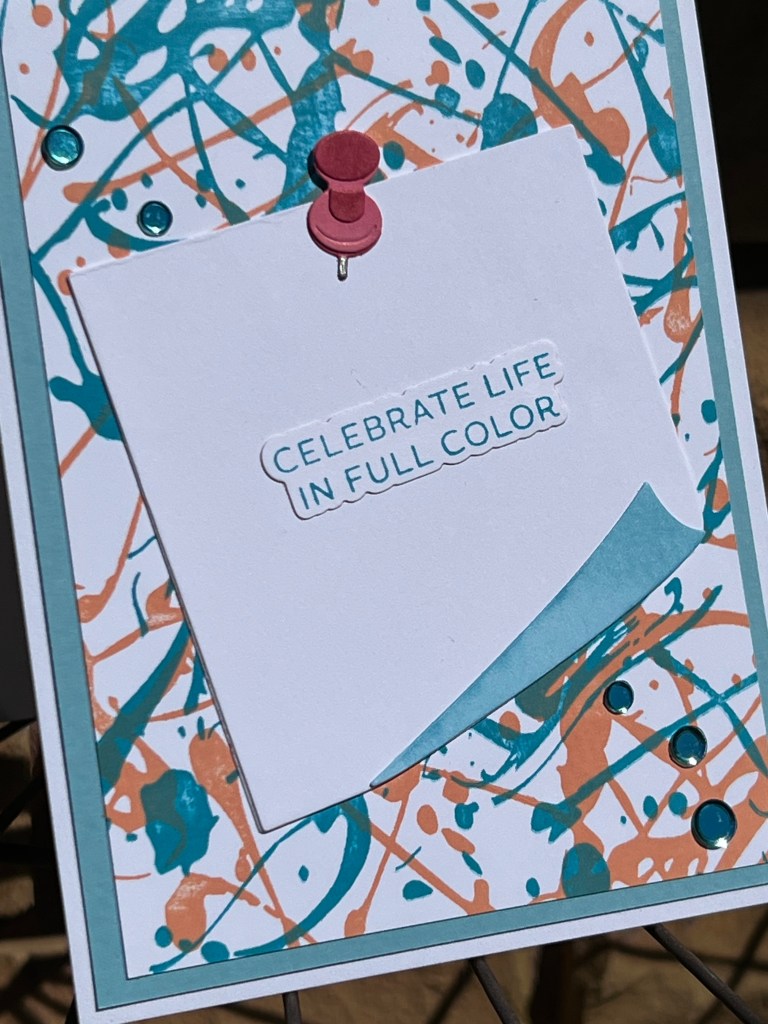 This card started with using the BetterPress and the Memo Splatter Press Plate. I ran it through once and rotated the platter for a second pass with a contrasting colour . First with Pinkfresh Mimosa Ink then Pinkfresh Paradise ink.