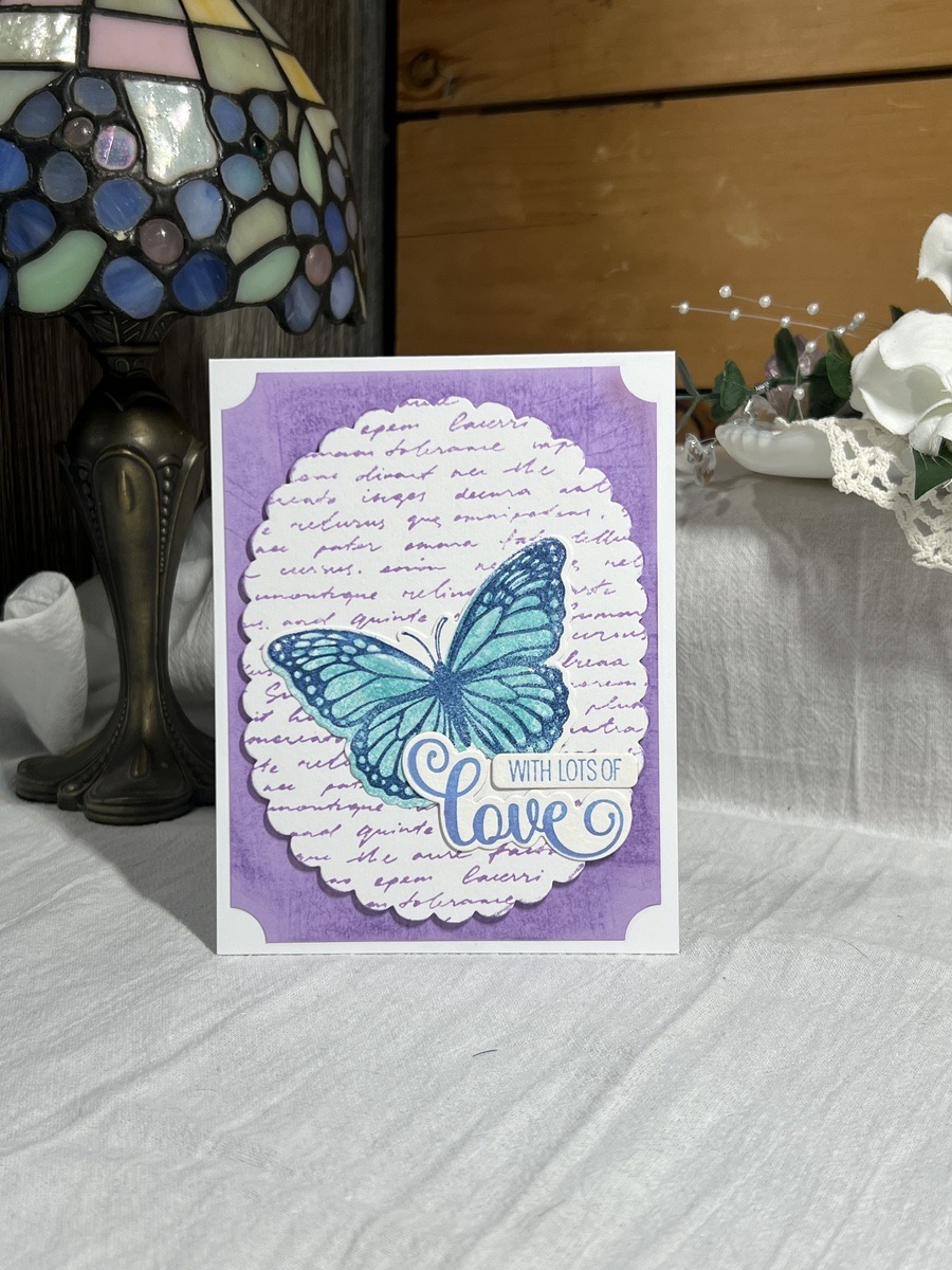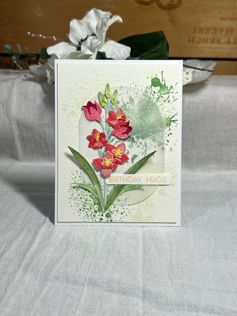 This card uses the **Splatters Press Plate, **Layered Gladiolus Cutting Dies, **Scallop and Stitched Edge Ovals Cutting Dies and the Very Best Wishes Sentiment Set I used Hero Arts Inks on the background and Daniel Smith Watercolour cards from Hero Arts to paint the leaves and flowers.
