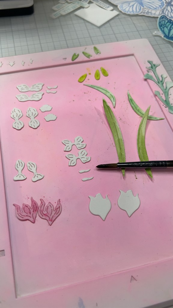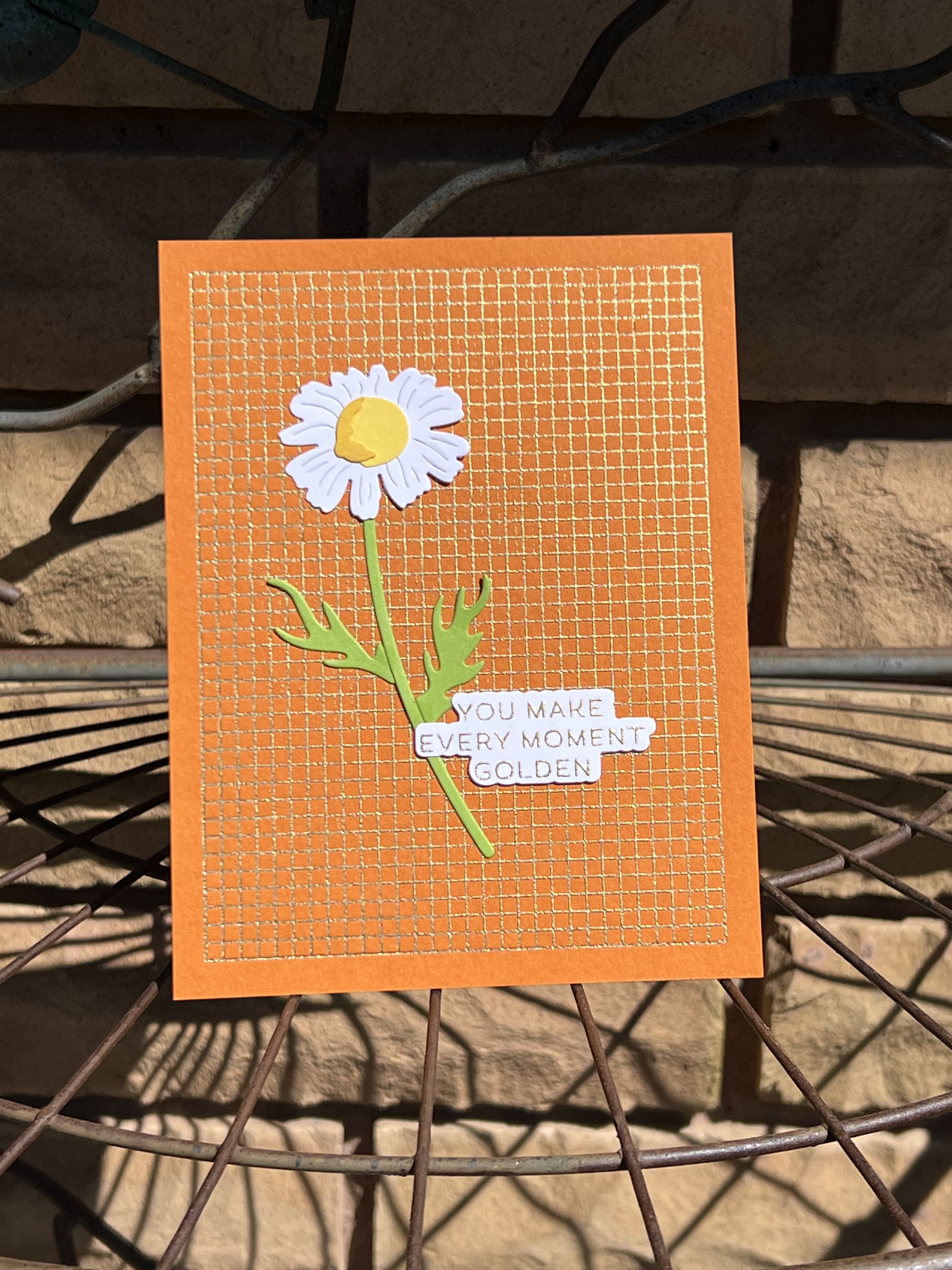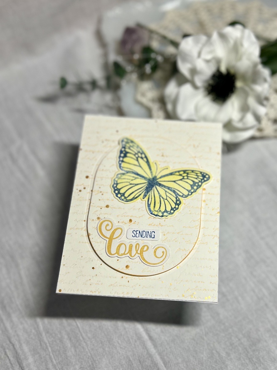 I used the Oval Cutting Dies to cut out velum to be a soft anchor for the floral focus piece and 140 lb watercolour paper for the Splatters Press Plate. If you look closely you can see the impression left in the paper. The texture adds a lot in person!