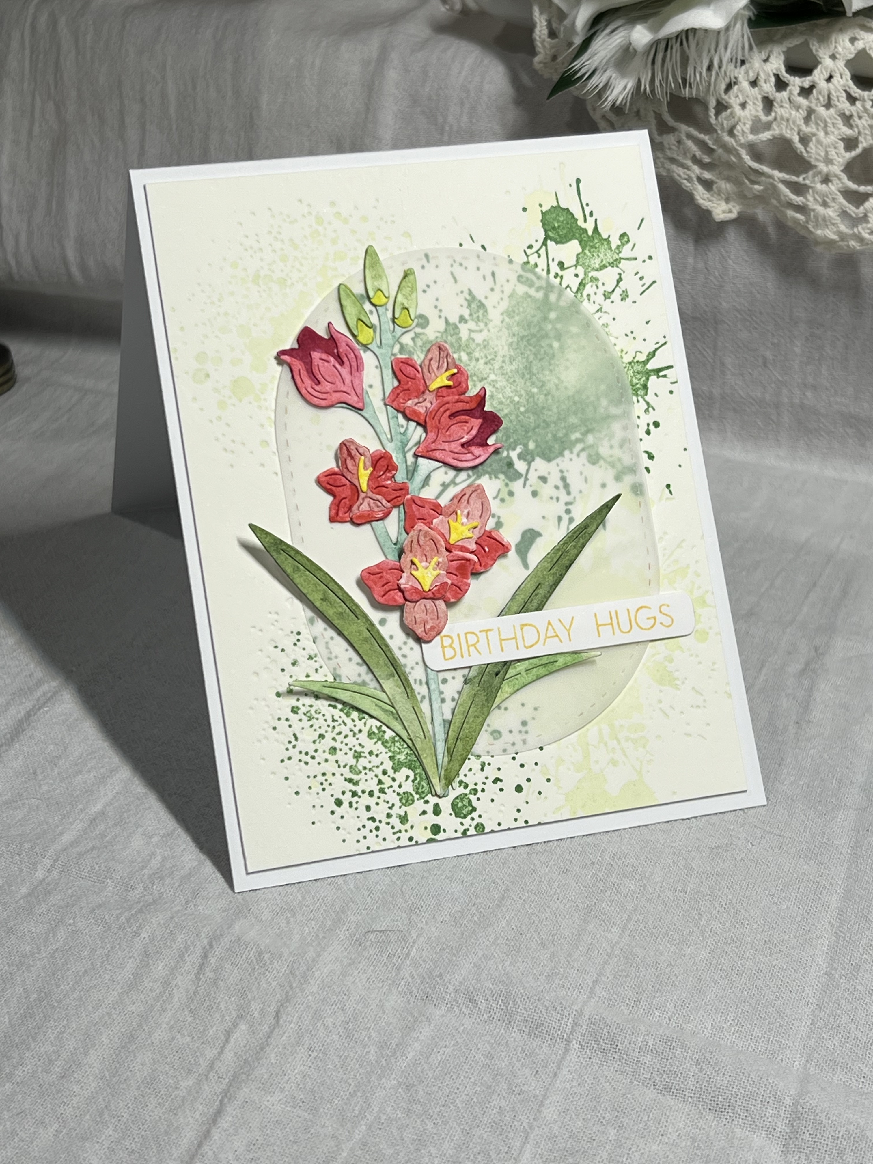 This card uses the **Splatters Press Plate, **Layered Gladiolus Cutting Dies, **Scallop and Stitched Edge Ovals Cutting Dies and the Very Best Wishes Sentiment Set I used Hero Arts Inks on the background and Daniel Smith Watercolour cards from Hero Arts to paint the leaves and flowers.