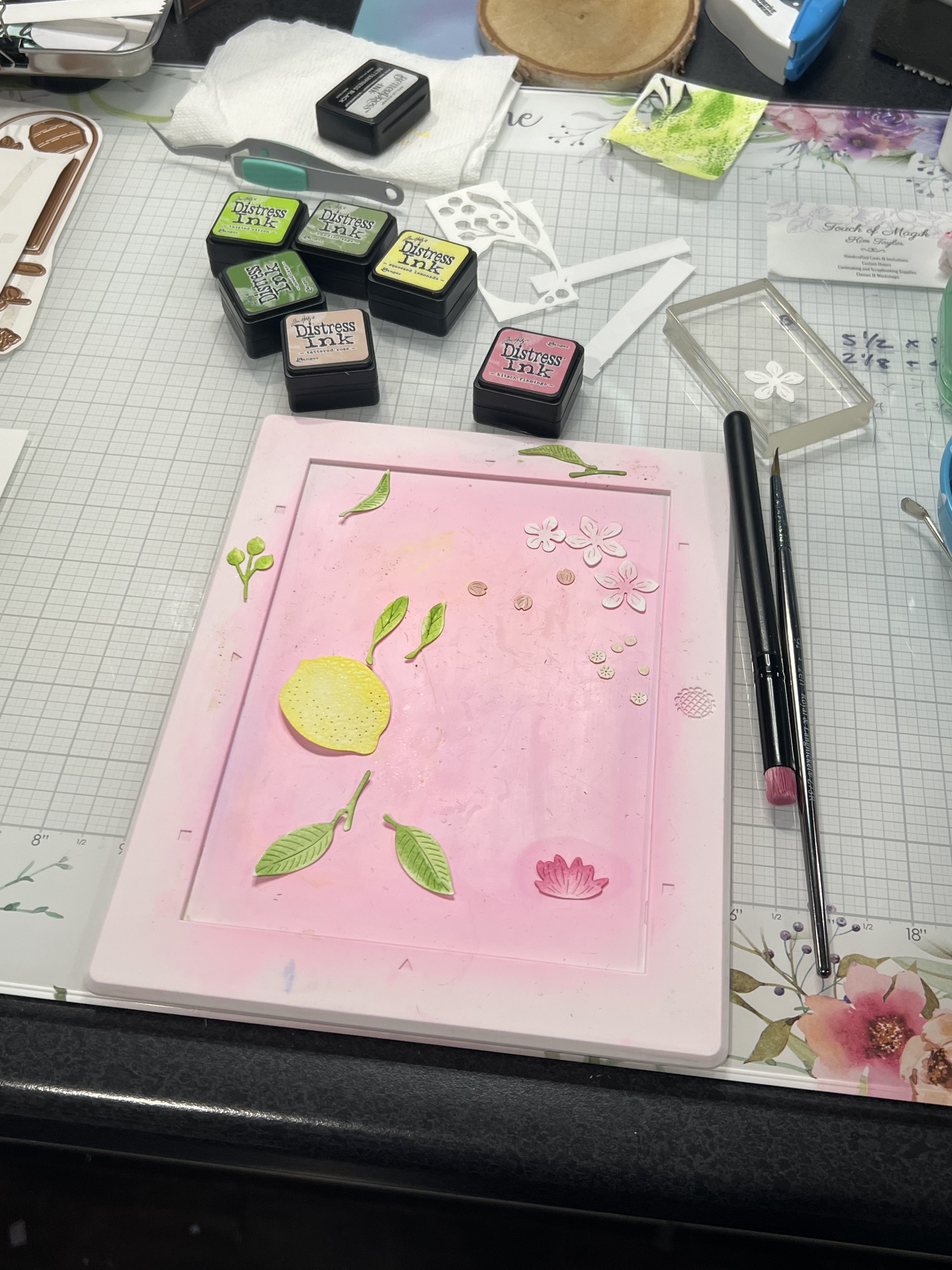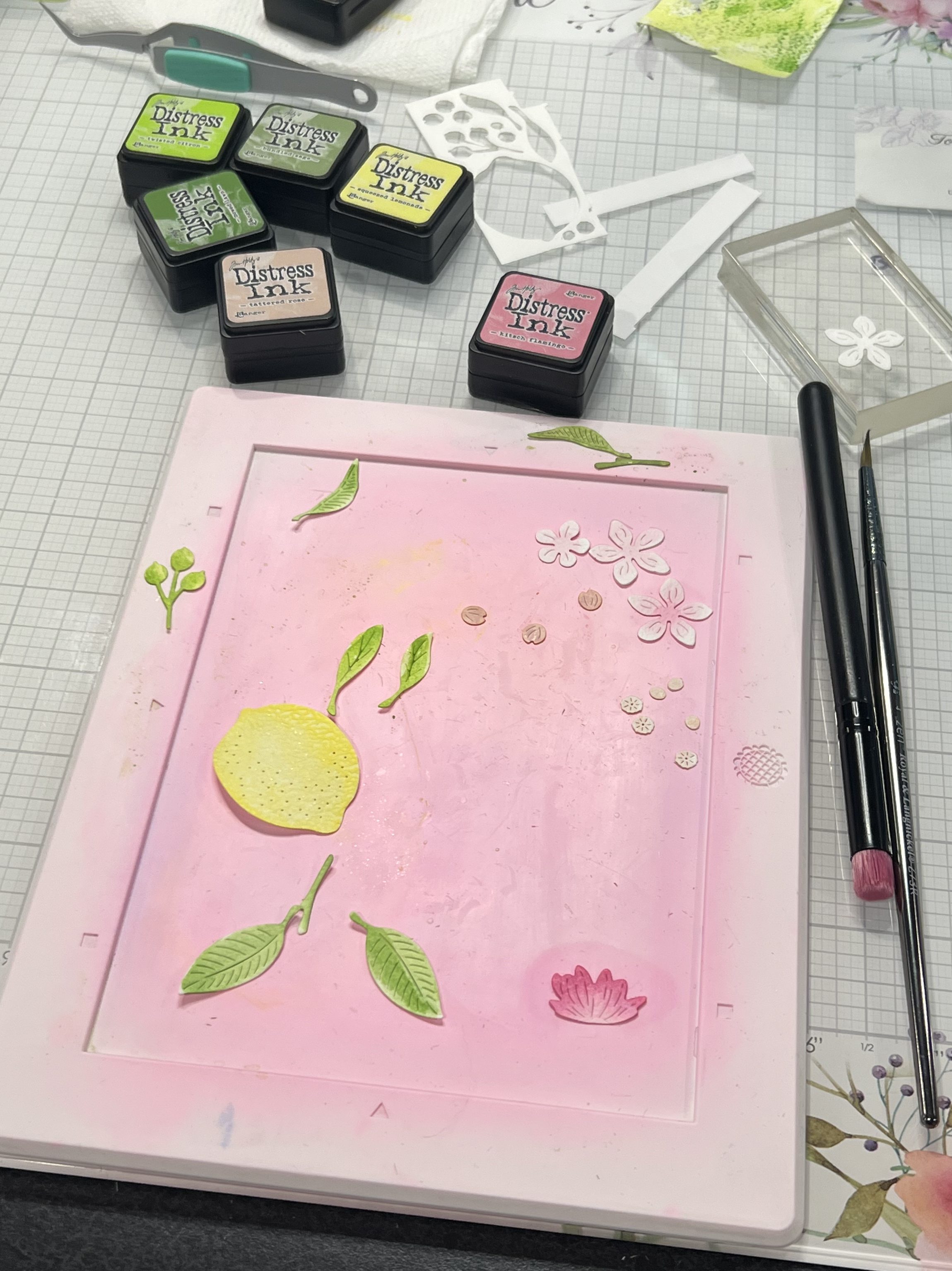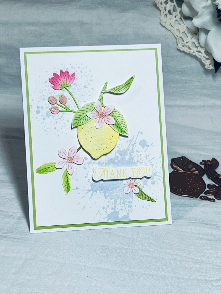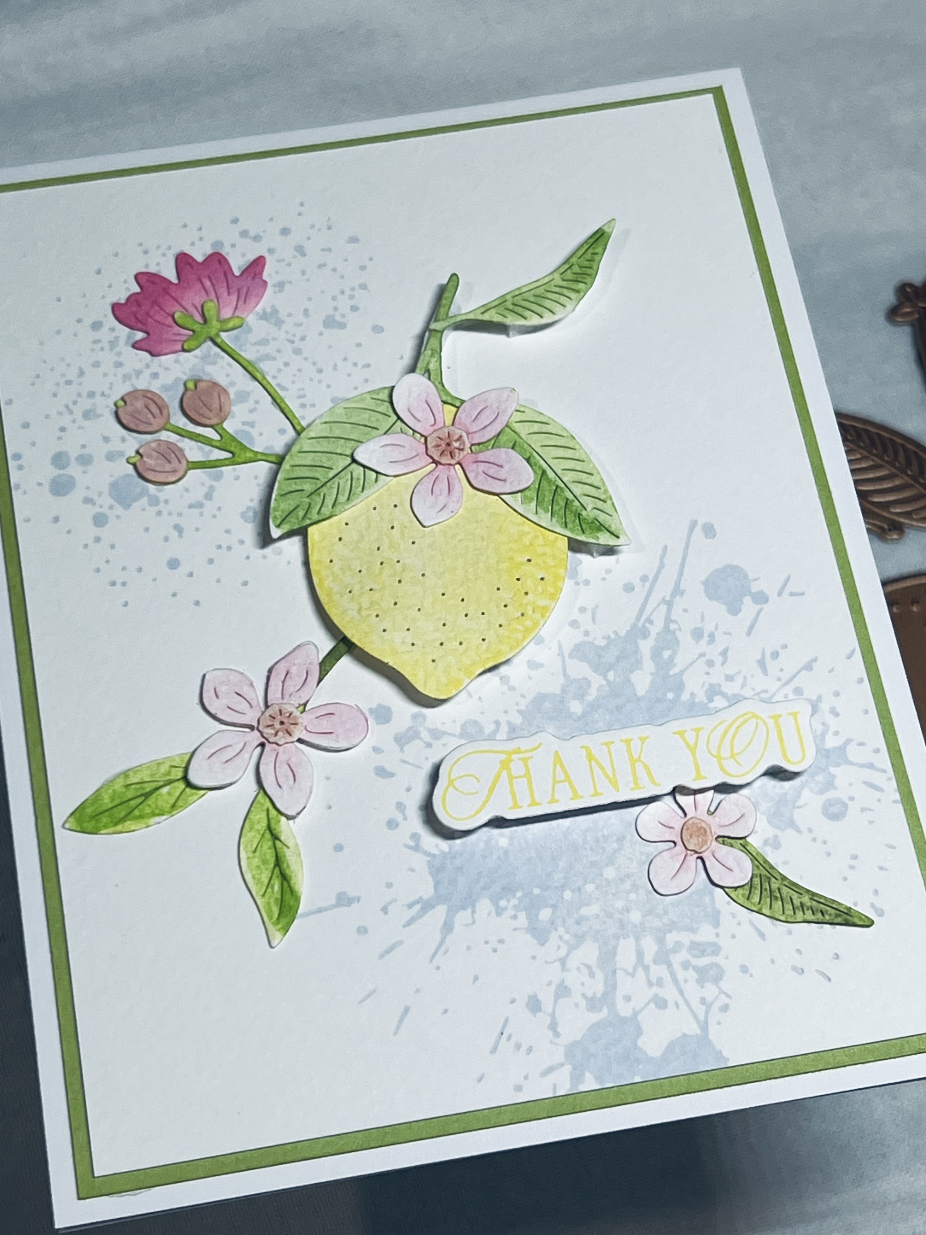 I combined the *Splatter Press Plate from May with the *Citrus Spritz Dies from the new release for this sweet card. The sentiment is from the *La Dolce Vita sentiments Press Plate and Die Set. The images were cut from watercolour 140lb Cannon XL paper and watercoloured with Distress Inks.