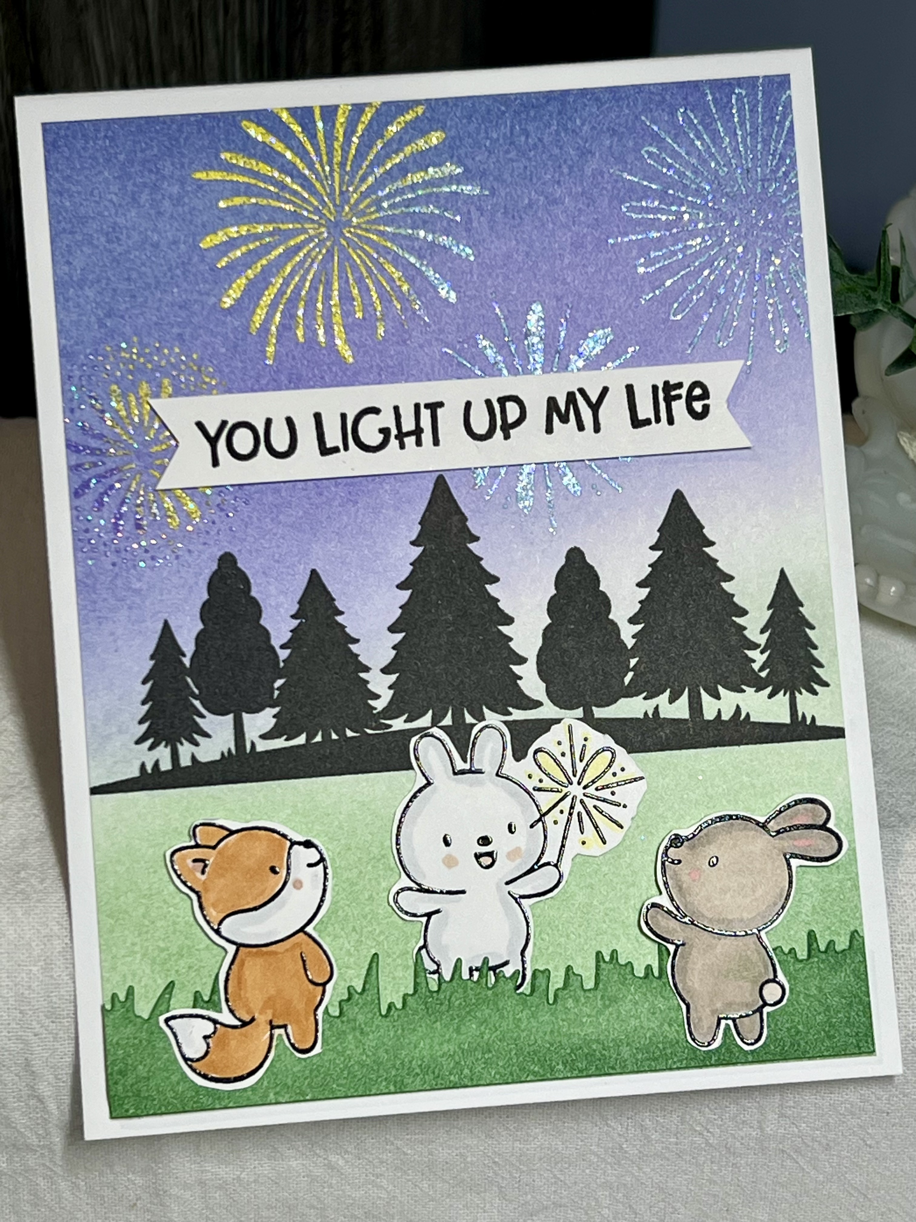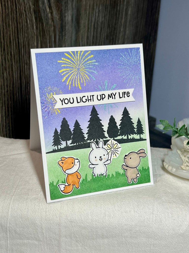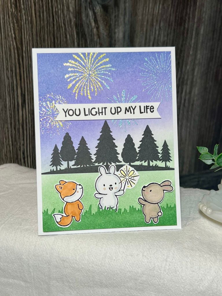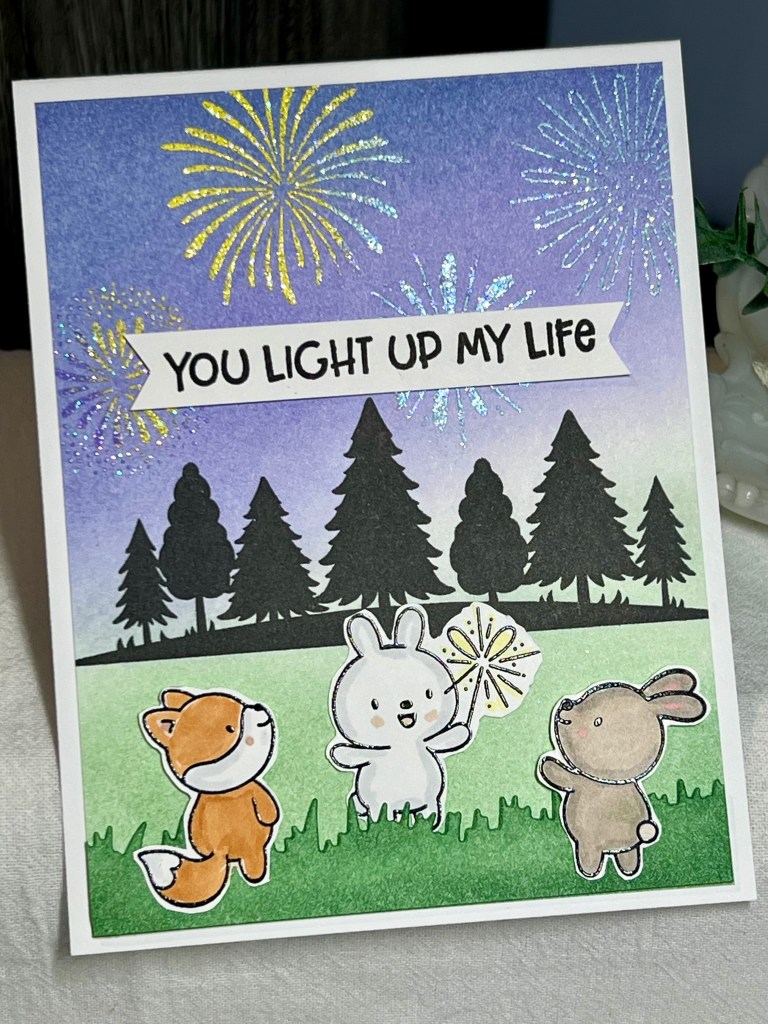 This card was really fun to make! It started with ink blending the sky and grass… I was careful to not over lap those very much as I didn’t want a neutral in the middle. I stamped the fireworks images in Versamark once the panel had dried and I swooshed it with embossing powder. Then I carefully used several colour of sparkly embossing powder to mimic the colours of real fireworks.